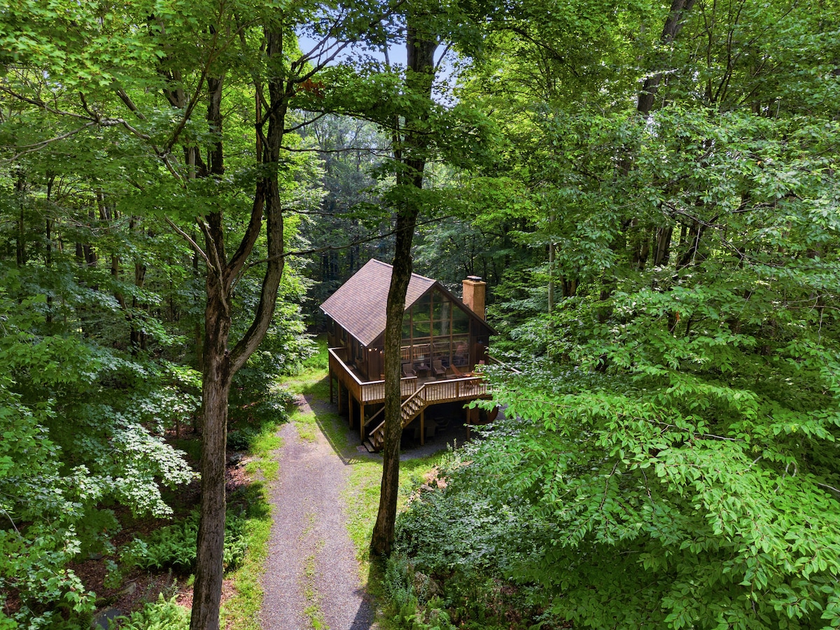 Newly renovated 4BR/3BA chalet on 10 private wooded acres in the Pocono Mountains. Sleeps up to 12 guests and is packed with amenities: a sauna, indoor fireplace, outdoor fire pit, two dedicated workstations with fast Wi-Fi, a yoga space, sunroom, and a fully stocked kitchen. Whether you’re seeking adventure or relaxation, you'll have quick access to the Pocono Mountains top attractions—whitewater rafting on the Lehigh River and skiing at Blue Mountain, Camelback, Jack Frost, or Bear Creek.