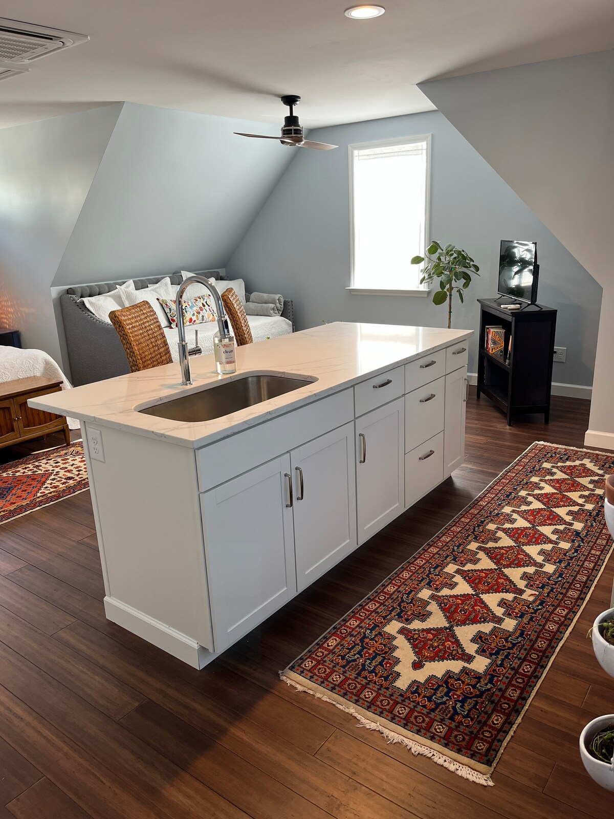 Zrelaksuj się w tym położonym w centrum, zabytkowym apartamencie typu studio. Ta przytulna przestrzeń oferuje mnóstwo słońca i otwarty plan piętra ze sklepionymi sufitami. Całkowicie przebudowane z nowymi szafkami kuchennymi, licznikami kwarcowymi, urządzeniami ze stali nierdzewnej i wszystkimi podstawowymi elementami, które pozwolą Ci cieszyć się pobytem. Ciesz się kabiną prysznicową z dodatkowymi półkami na wszystkie Twoje rzeczy. Pluszowe łóżko typu queen-size. Centralnie położony, dzięki czemu można dotrzeć pieszo do parków lub restauracji, lub po prostu zrelaksować się na zadaszonym balkonie.