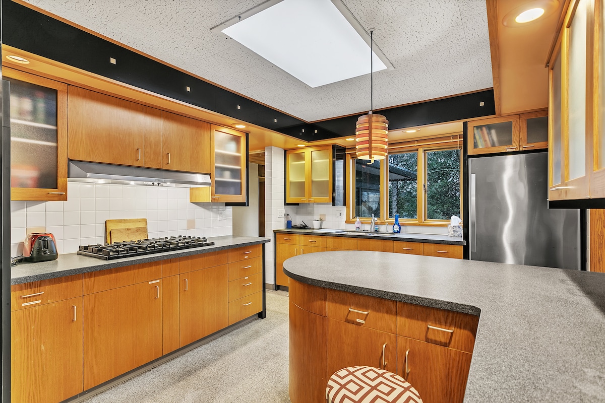 The Pond House, zabytkowa szklana chatka wypełniona sztuką, widokami na wodę i eklektycznymi klimatami, prywatnie położona na świętej ziemi Hackmatack Retreat Center. Preria, kręta, powolna rzeka, dwa stawy, ponad 200-letnie dęby i wielkie niebo – niezliczone miejsca, w których można się zwinąć, zebrać, skupić – zakamarki i zakątki wewnątrz i na zewnątrz, oferujemy „czas na odpoczynek” pośród tego hałaśliwego świata. Kilka minut od 2 małych miast, wszystkie udogodnienia, chodzi nam o spokój i łatwość - pozwól nam spersonalizować Twoje doświadczenie!