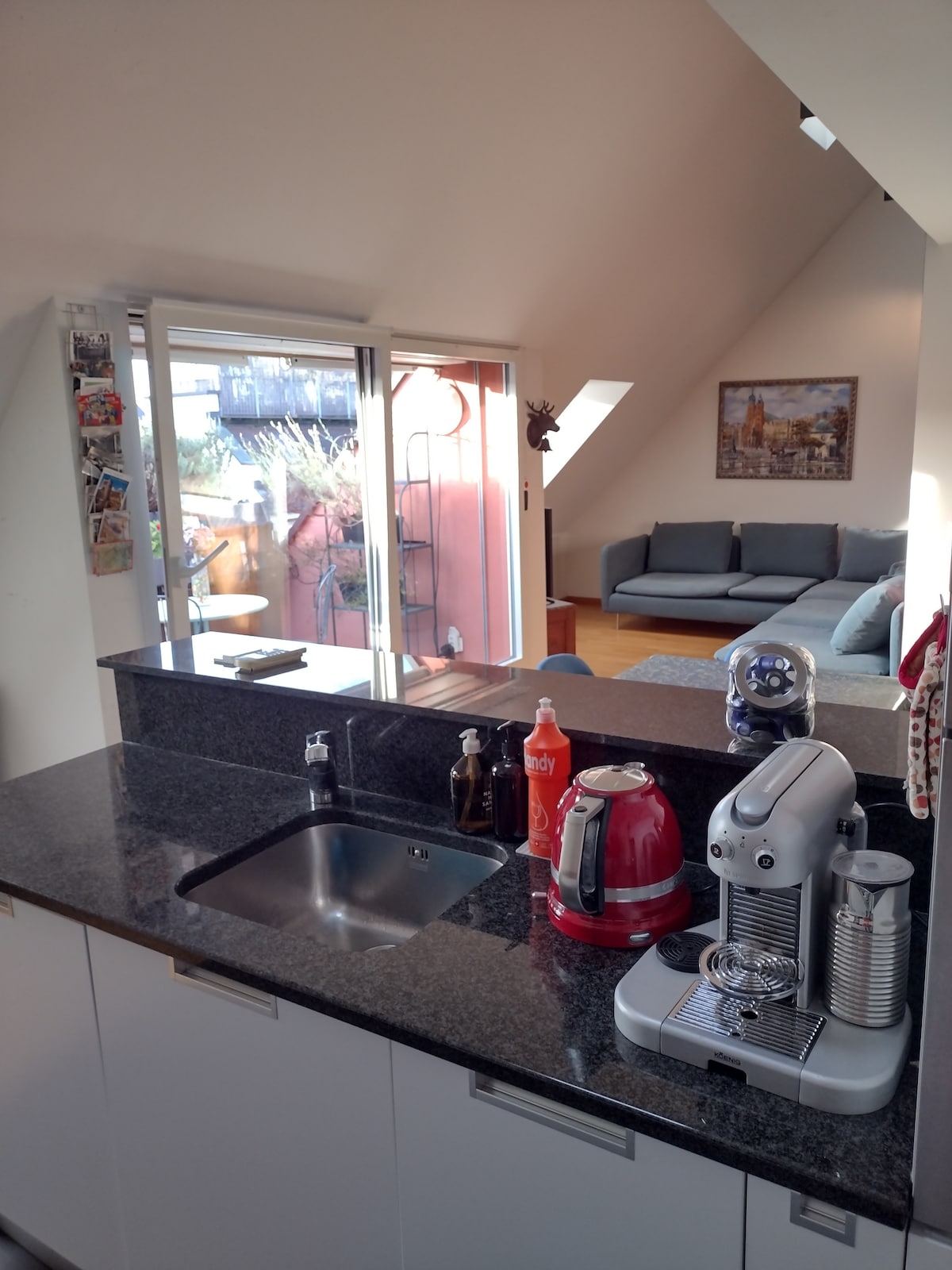 Nasz pięknie urządzony Apartament na poddaszu w domu wiejskim z XVI wieku jest położony w spokojnej i i centralnej okolicy. Możesz odpocząć podczas długich spacerów po pięknych lasach lub wzdłuż idyllicznych brzegów Renu z licznymi kąpieliskami. W 5 minut można dotrzeć pieszo do restauracji, supermarketów, basenu i dworca kolejowego. Jestetten jest idealną bazą wypadową do takich miejsc jak Czarny Las, Jezioro Bodeńskie/Konstanz, Zurych i Alpy. Pociągi do Zurychu i Szafuzy kursują co pół godziny.