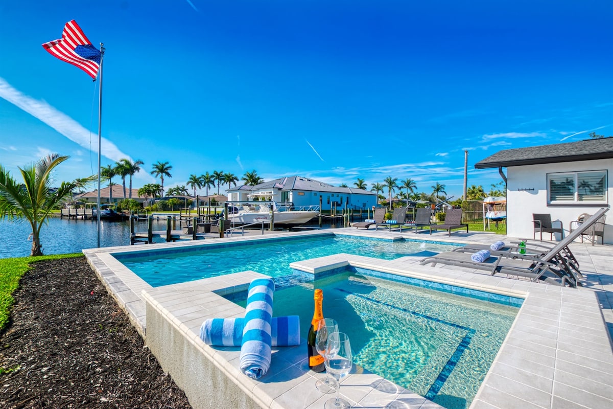 Sea You at the Cape, the perfectly located SW Florida getaway. Enjoy this stunning home on a wide canal. Watch the boats go by from your saltwater infinity edged pool, hot tub, or from the newly renovated interior. This home will help you breathe easier, laugh more, relax, and rejuvenate. Then hop on the provided kayak or bicycles to explore Cape Harbor and the many restaurants, shops, bars, and activities of Cape Coral. By boat enjoy the gulf and beaches just a mere 20 minutes away. Enjoy!