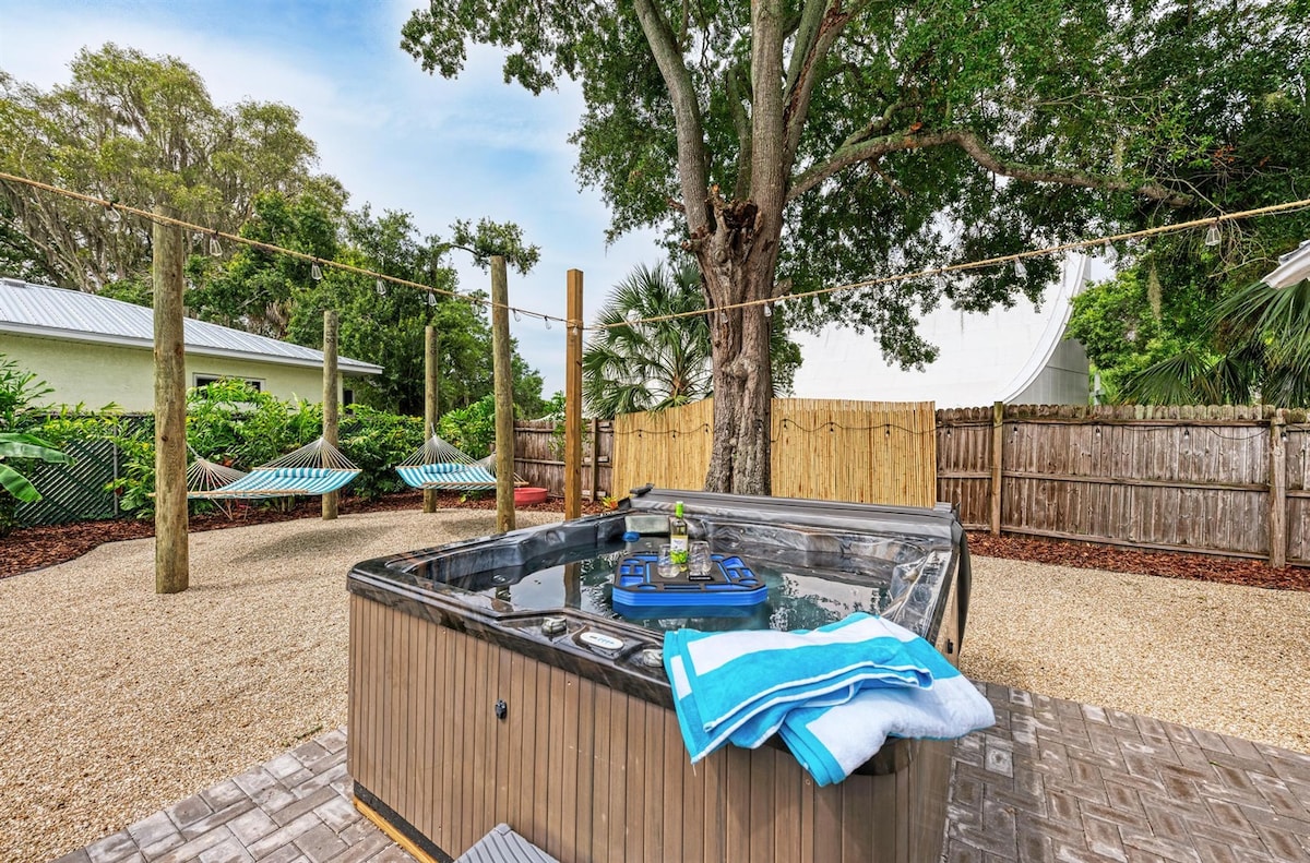 City Garden Cottage to przytulny i wygodny domek położony w cichej dzielnicy Laurel Park w Sarasocie, zaledwie kilka przecznic od centrum miasta. Studio jest otoczone bujnymi ogrodami i drzewami z jacuzzi. Wewnątrz znajdziesz aneks kuchenny wyposażony w ekspres do kawy, toster, lodówkę i płytę grzejną. Studio wyposażone jest również w telewizor z płaskim ekranem, duże łóżko podwójne i łazienkę. W wynajmie uwzględniono również wspólny grill gazowy, palenisko i wannę z hydromasażem.