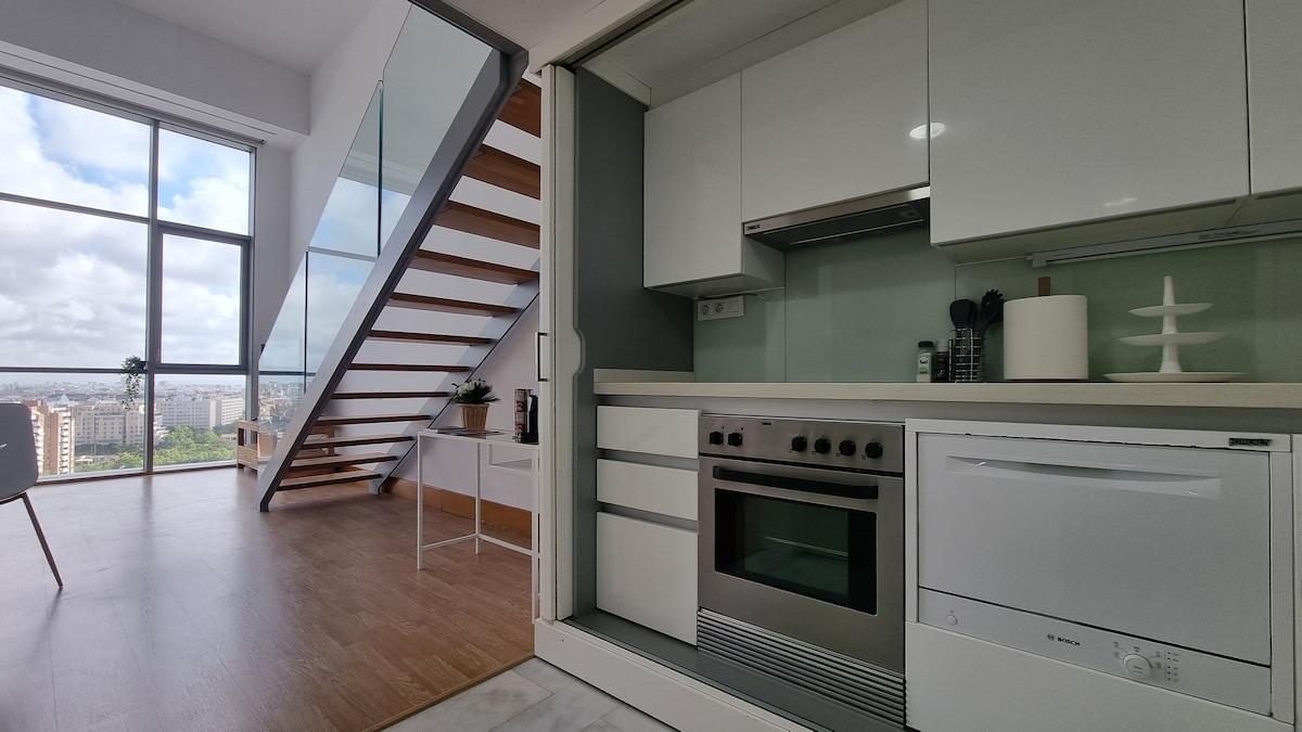 Apartamento Duplex, altura 16 con vista panorámica fantástica y altas prestaciones superiores a un hotel. Totalmente insonorizado, ideal para descansar sin ruidos. Perfecto para parejas como espacio único y exclusivo Junto al centro comercial ARENA con tiendas y restaurantes. Parking privado gratis conectado con el loft por ascensor. Metro y supermercados a 2 min andando.Playa a 5 min en coche. Uso exclusivo parejas : NO se permiten niños ni visitas. WiFi +TV65'' y cocina completa con todo.