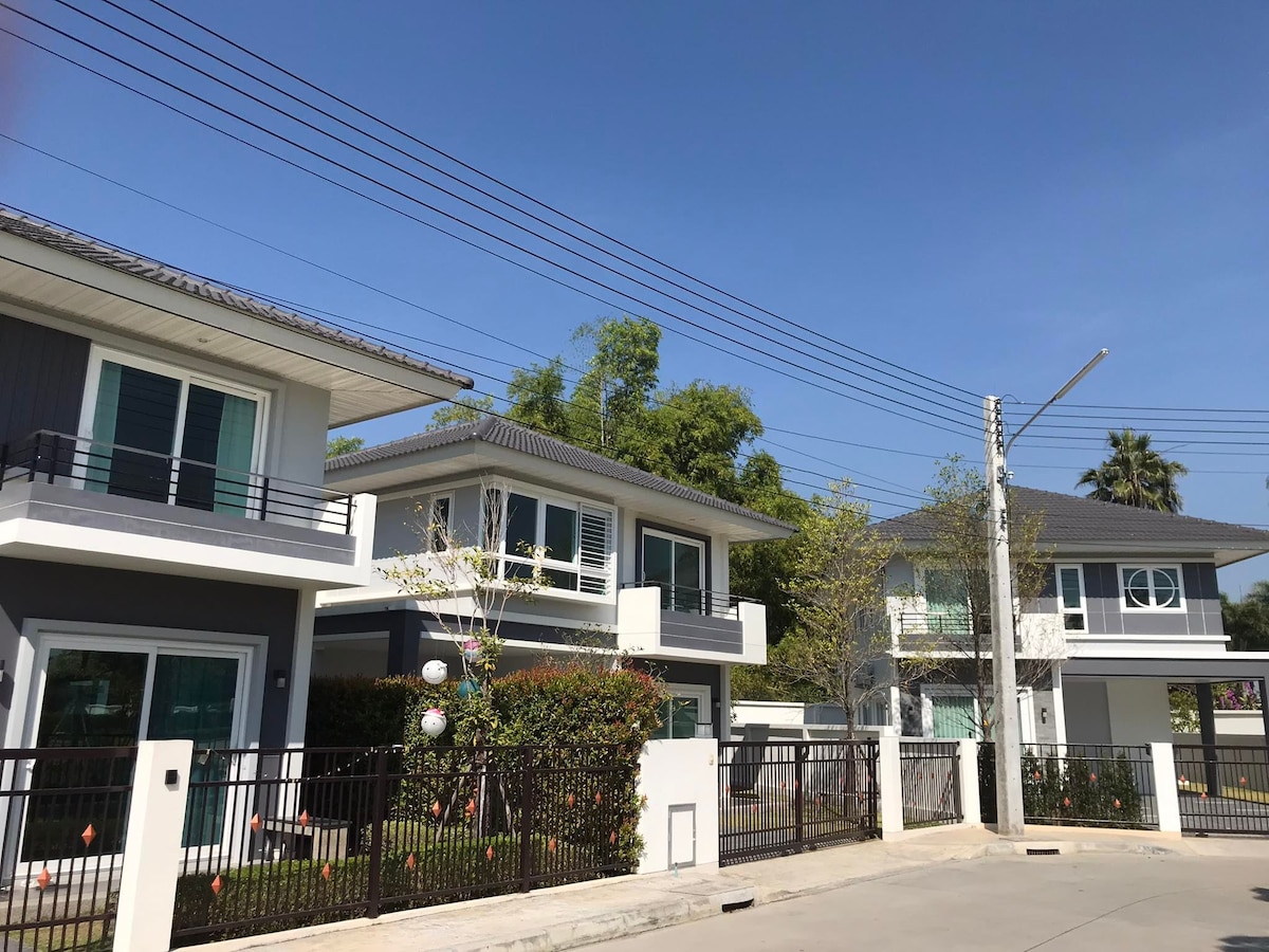 Zrelaksuj się z całą rodziną w tym spokojnym miejscu na pobyt. 15-20 minut od lotniska. Dom w centrum handlowym Kad Farang Village. W pełni umeblowany tajski styl Lanna 240 m2. w tym mały ogródek i parking. Zwierzęta są akceptowane.