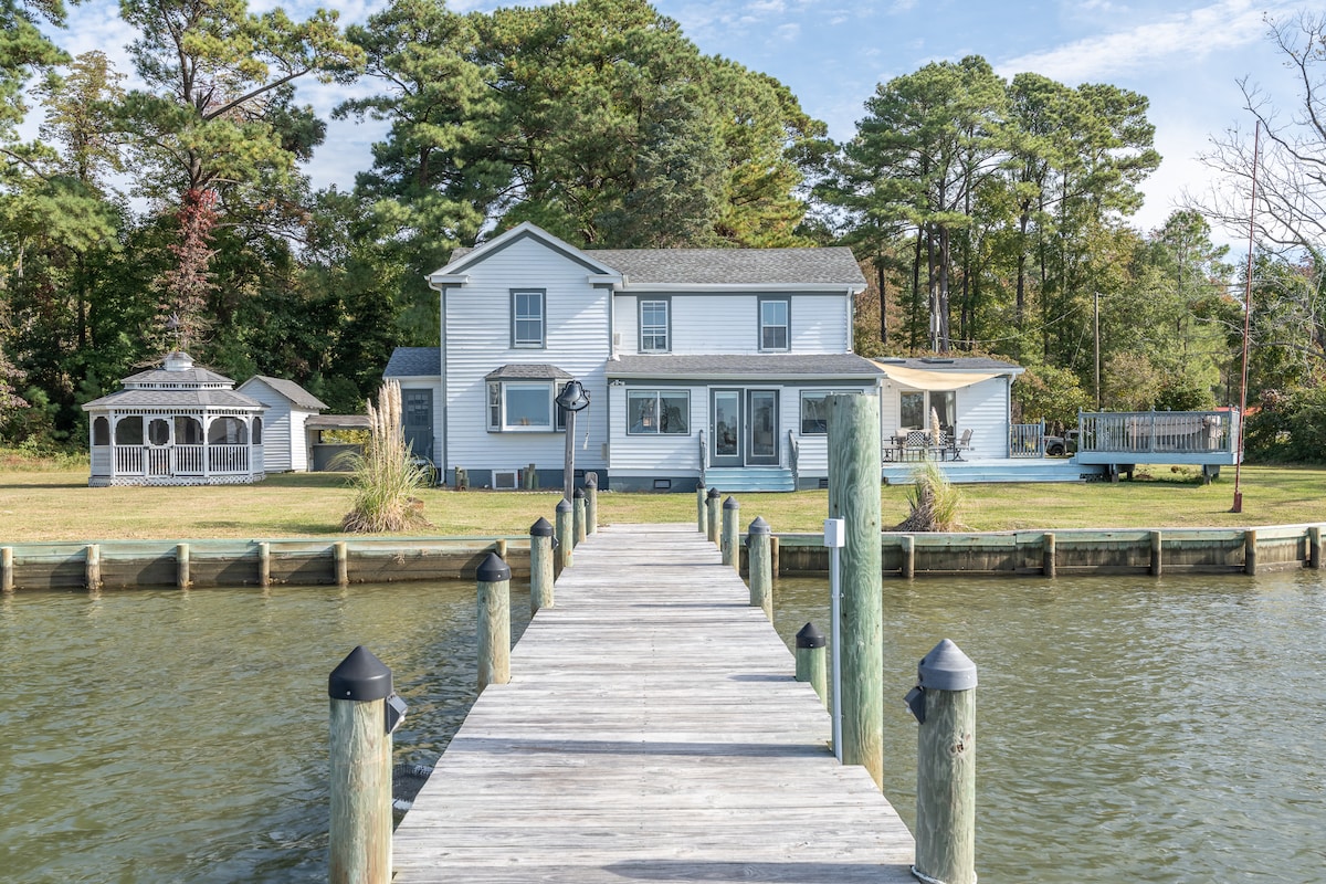 Enjoy the Northern Neck as you overlook the Chesapeake Bay & Pretince Creek, while relaxing on the waterfront setting of this 4 bedrm & 2.5 bathroom house. Enjoy crabbing & fishing (w your rod) on the pier; if you are arriving by boat, dock has deep water. Several adult & child kayaks & 2 paddle boards provided. Ditchley Cider Works is a 1/2 mile walk/ride House is 5 minutes from Kilmarnock. Enjoy the local wineries, restaurants, shopping, antiques, seafood, tranquility, & nature.