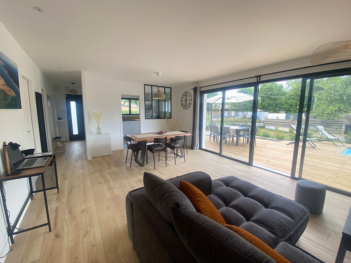 Na skraju lasu znajduje się WSPANIAŁY nowy klimatyzowany dom z basenem ogrzewanym panelami słonecznymi, ozdobiony smakiem i miłością. Poczujesz się jak w domu ze słodyczą wakacji w bardzo miłym, WYGODNYM i modnym miejscu. Wszystko jest zapewnione, aby niczego nie przegapić. W ciągu kilku minut rowerem, samochodem lub pieszo, można cieszyć się basenem Arcachon i jego pięknymi plażami. Nie wahaj się, zarezerwuj spokojny pobyt, aby poczuć się jak u siebie.