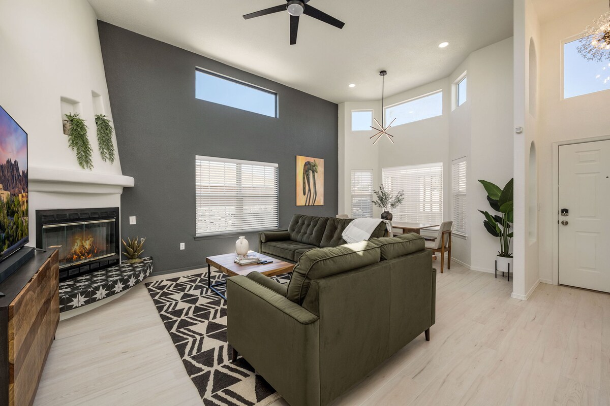 This fully-furnished modern home is perfect for weekend getaways or longterm stays. With latest in appliances and style, the Powder River Villa offers the comfort of home with a luxury feel. Stream Netflix in front of the stacked stone fireplace, decompress in the pebble rain shower, or simply relax on the back porch to the beautiful New Mexico sunsets. This stylish space can be the romantic escape you're seeking or comfortably fit your group of 7.