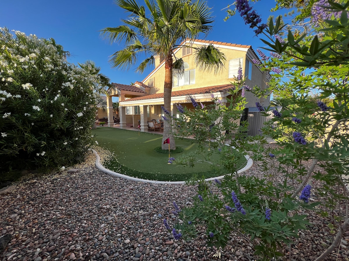 Nasz dom jest idealny dla rodzin, firm lub podobnych grup (bez IMPREZ, SPOTKAŃ lub WYDARZEŃ, bez ZWIERZĄT bez WYJĄTKU! ZAPYTAJ przed rezerwacją, jeśli jesteś osobą lokalną, zapraszasz dodatkowych gości lub przyjeżdżasz ze zwierzęciem asystującym) Położony 5 minut jazdy od lotniska i stadionu Raiders, 10 minut od pasa, położony w bardzo cichej okolicy w pobliżu najlepszego premium outletu w Las Vegas. Przeczytaj nasze recenzje! Na podwórku znajduje się 1000 m2, 6 dołków zielonych. Dom o powierzchni 2600 m2 ma 2 pokoje dzienne, 1 pokój gier i jadalnię.