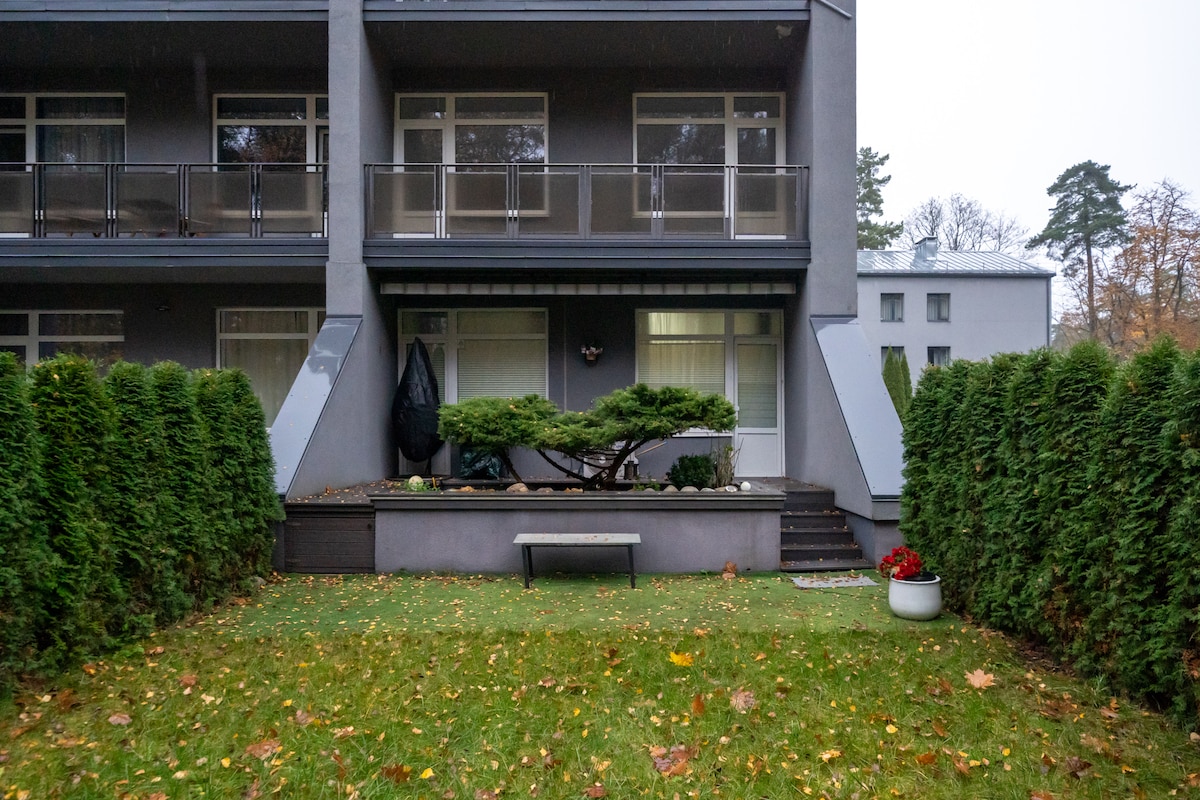 Relax with the family at this peaceful place. Apartment is surrounded by pine trees and backyard is sunny and cozy. Walking: - the sea is 10-15 min (3 min with car) - big children's playground park "Kauguru parks" 400m away, 5 min. - big grocery stores 15 min (3 min with car) By car: - Jūrmala centrum 15-20 min - Dzintari concert hall 15-20 min Terrace + garden Free parking Wifi