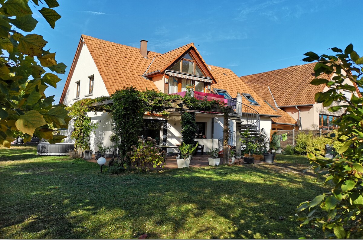 Apartament na piętrze, odnowiony, z osobnym wejściem. Pokój z telewizorem, pokój z rozkładaną sofą, biurkiem i telewizorem, w pełni wyposażona kuchnia, jadalnia, łazienka z prysznicem i toaletą. Bardzo szybkie Wi-Fi i parking. Mieszkamy na miejscu i jesteśmy do dyspozycji w razie jakichkolwiek pytań. Apartament położony jest 15 minut od centrum Strasburga, 5 minut od hali widowiskowej Zénith, 10 minut od Szlaku Wina Alzacji i 45 minut od parku rozrywki Europa Park. Zakwaterowanie odpowiednie dla osób w podróży służbowej