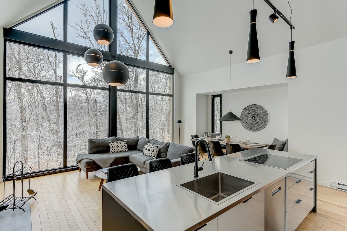 This forest chalet is an energy-efficient house on the private 10 acres hillside where the views are simply stunning. The architecture of the house is one of a kind with its exposed solid wood timber structure. Surrounded by the majestic beauty of the forest which gives you access to breathtaking ski slopes and splendid hiking trails only a few steps away. Enjoy ski at St. Sauveur and Mont-Tremblant and the chalet! ****Each guest must read additional rules before booking. ***