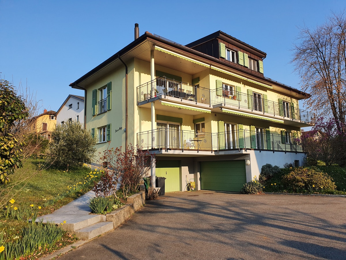 Ten uroczy niedawno odnowiony apartament znajduje się na drugim i najwyższym piętrze pięknego i dużego domu z dużym ogrodem, w którym mieszkamy, w cichej dzielnicy mieszkalnej. Zakwaterowanie to oferuje wspaniały widok na Jezioro Genewskie, Zatokę Montreux i góry we wszystkich porach roku. Latem można podziwiać ogród, kwiaty i lasy, prywatna przestrzeń do jedzenia i relaksu jest dostępna dla gospodarzy.