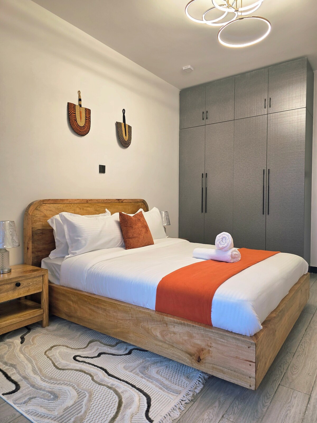 Spokojny, stylowy wypoczynek w samym sercu Kilimani. W tym przemyślanym wystroju mieszkania połączono ciepłe kolory ziemi, delikatne oświetlenie i naturalne tekstury, tworząc przytulną, nowoczesną przestrzeń. Zrelaksuj się w nasłonecznionym salonie z rdzawą sofą i dziełami sztuki, delektuj się posiłkami w eleganckiej jadalni lub gotuj w w pełni wyposażonej kuchni. W nocy zrelaksuj się w spokojnej sypialni. Idealne dla osób podróżujących w pojedynkę, par lub rodzin szukających komfortu, stylu i wygody.