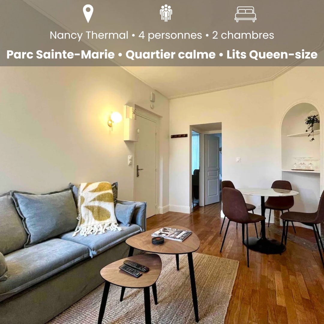Odnowiony, niezależny apartament typu studio, na parterze, wychodzący na dziedziniec, w spokojnej wspólnoty mieszkaniowej z XVIII wieku. Położone w centrum miasta, 5 minut spacerem od Placu Stanisława i Opery, w bezpośrednim sąsiedztwie wszystkich sklepów. W pełni wyposażone: telewizor, kuchenka mikrofalowa, lodówka, płyta indukcyjna, ekspres do kawy, czajnik, naczynia, pościel (prześcieradła, ręczniki). Po 20 minutach jazdy autobusem z Nancy Thermal, kuracjusze mogą korzystać z centrum miasta po zabiegach.