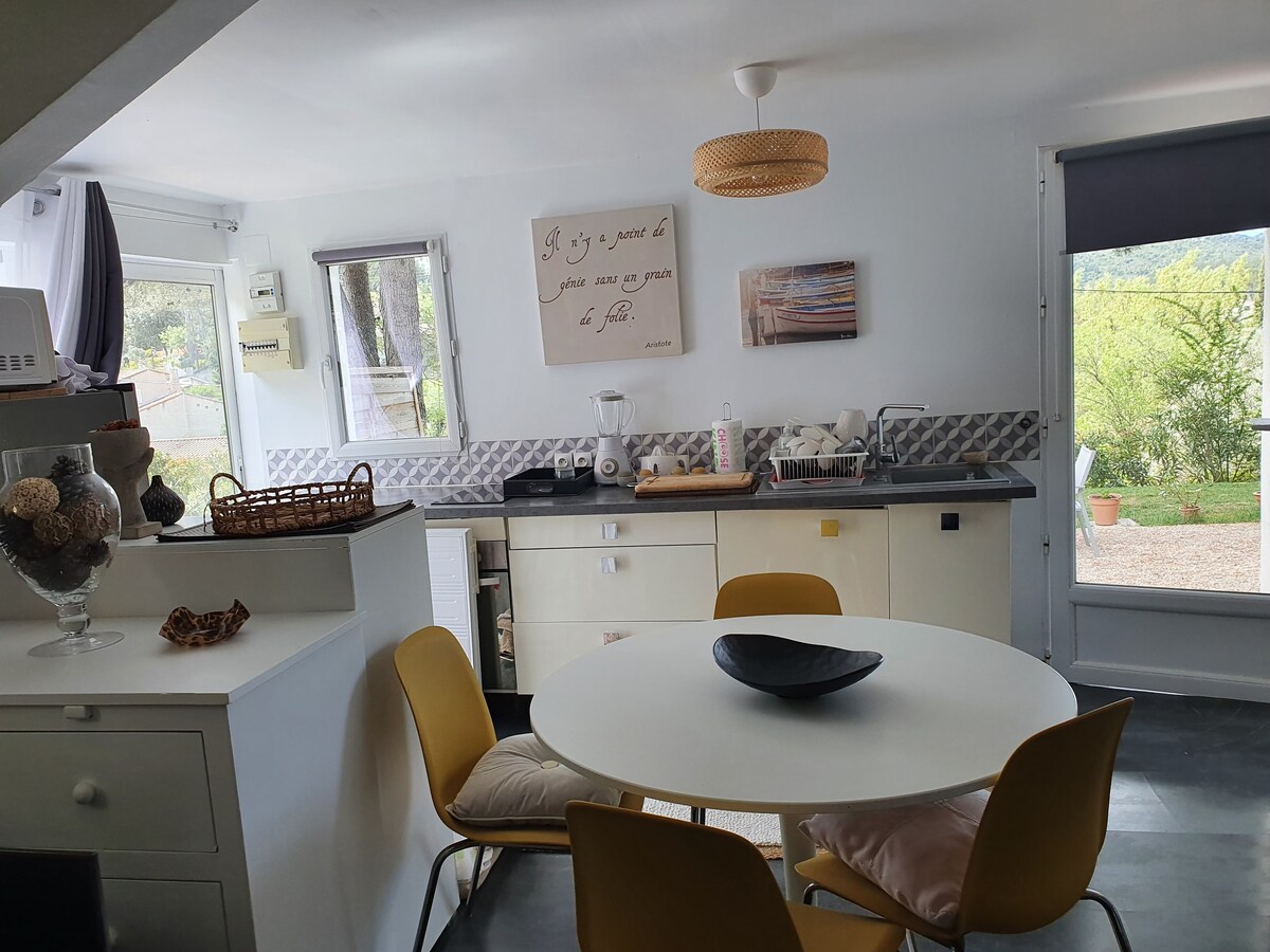 (PRZED ZŁOŻENIEM WNIOSKU PROSIMY O ZAPOZNANIE SIĘ Z CAŁYM OPISEM) Witamy w Cadolive, prowansalskiej wiosce w Massif de l'Étoile. Urocze studio o powierzchni 35 m² jest POŁĄCZONE z PARTEREM NASZEGO DOMU. Wejdź przez małą werandę i przejdź bezpośrednio do salonu/kanapy. Pokój dzienny oddzielony zasłoną. Łazienka z kabiną prysznicową i toaletą. Dostęp do basenu i relaksującego ogrodu, który znajduje się przed naszą willą + prywatny ogród tylko dla Ciebie.