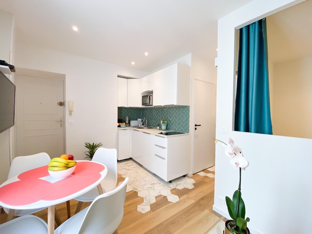 Witaj w swoim przytulnym kokonie w samym sercu Cannes! Zaledwie 200 m od dworca kolejowego i 600 m od Palais des Festivals, Croisette i plaż . To studio jest idealne dla pary lub osoby podróżującej w pojedynkę, które szukają wygody, stylu i świetnej lokalizacji. Co Ci się spodoba: – Nowe meble i elementy dekoracyjne, gustownie zaprojektowane – Bardzo wygodne łóżko z wysokiej klasy materacem — na wymarzone noce – Nowoczesna kuchnia – Wentylator sufitowy, Wi-Fi, telewizor.