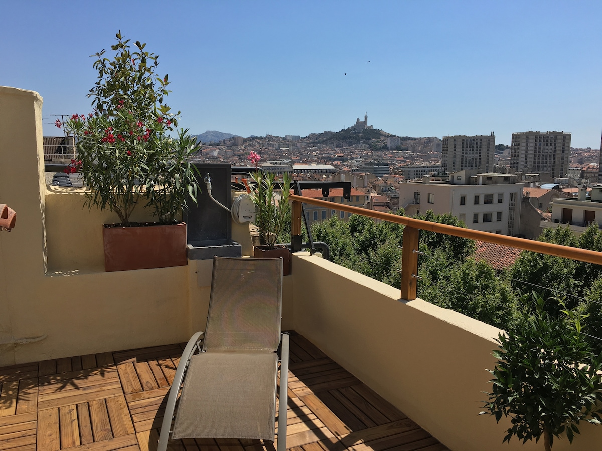 logement spacieux avec vue exceptionnelle sur Marseille collé à la magnifique église notre dame de la garde au sommet de la colline. Il est situé 20 mn à pied de la corniche et plage ainsi que du centre-ville vieux port. Vos nuits seront dans les étoiles et vous serez réveillés par les cloches de la basilique. Une terrasse de 50 M2 pour prendre vos petits déjeuner et repas au dessus de la ville et la mer. Fêtes interdites et bruits entre 23 h et 7 h aussi. Merci pour le voisinage.