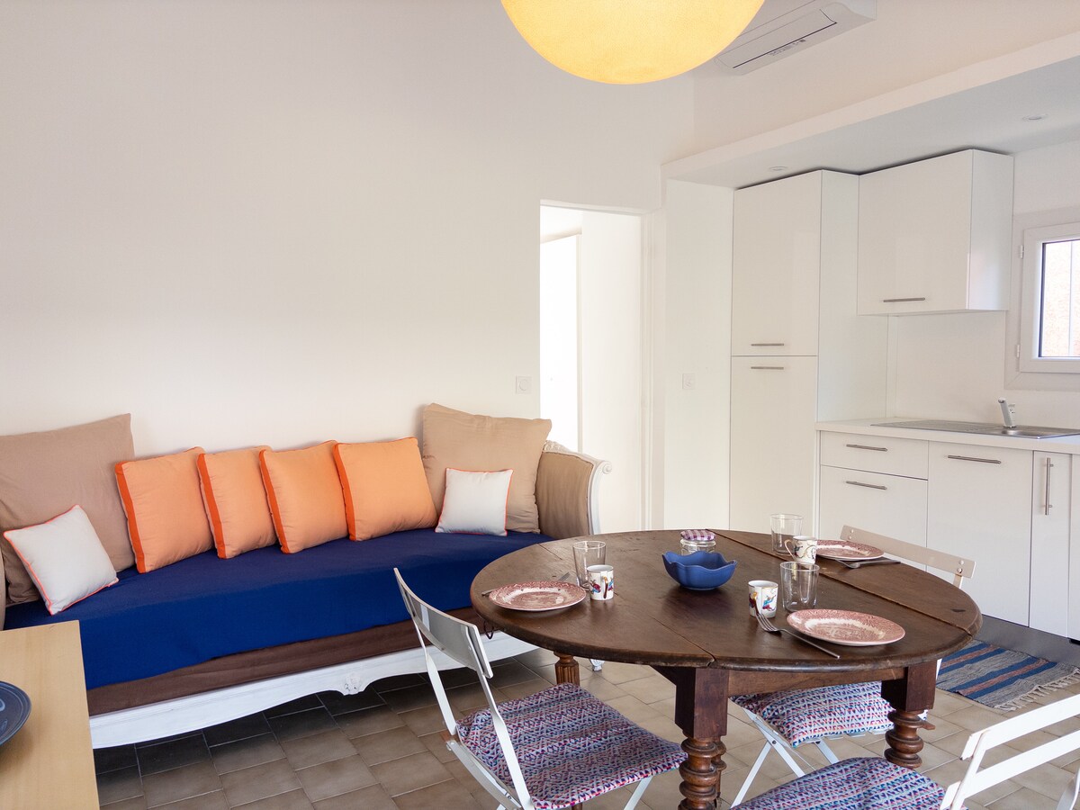 Laissez vous charmer par ce logement idéalement situé avec accès direct à la plage. La résidence est fermée et vous avez votre place de parking . Appartement entièrement rénové début 2025 parfait pour accueillir jusqu'à quatre personnes: chambre équipée d'un lit en 140 cm et un canapé convertible dans la salle de séjour. Cuisine équipée : four, micro-ondes, lave-vaisselle. Climatisation Internet Lave-linge A proximité du village, vous pouvez accéder à pied aux commerces, et au marché.