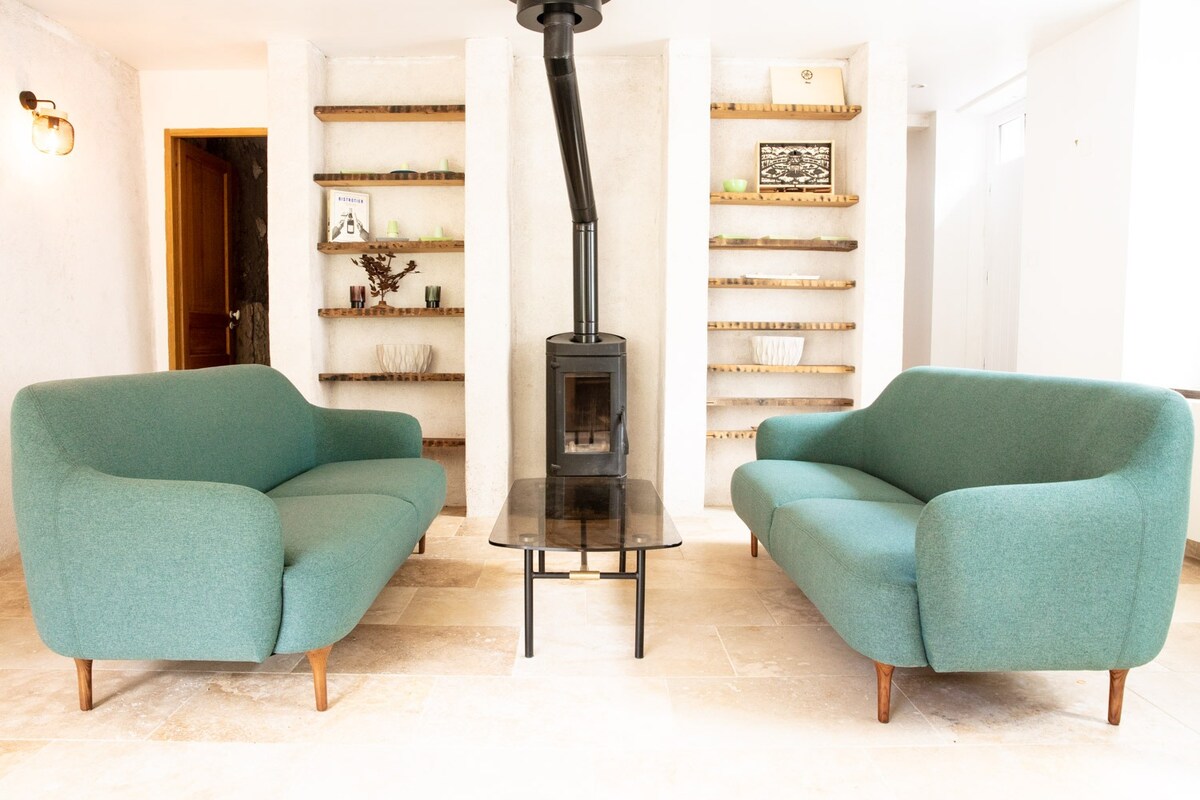 Współczesny dom architekta w całości wykonany z naturalnych materiałów. Fasada wykonana jest z marmuru, a konstrukcja i izolacja z drewna. Hojne obfitości tego kompaktowego domu z dużymi oknami od podłogi do sufitu zanurzają Cię w doświadczeniu zanurzania się w przyrodzie i podróży z naturalnym światłem. Ten ekologiczny i wygodny dom przywita Cię zimą na rogu kominka lub na tarasie i odświeżającym basenie na piękne pobyty na wsi.