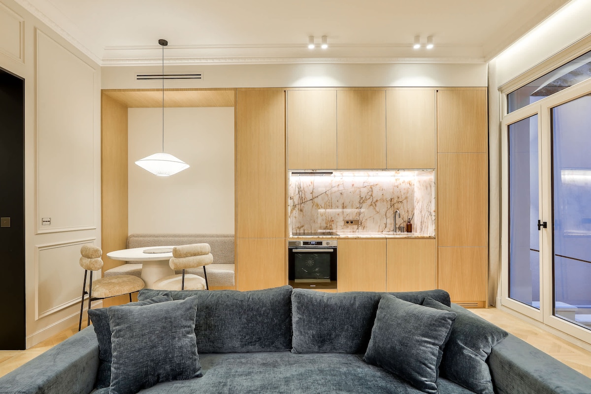 Overlooking our stunning inner courtyard and the charming neighboring church, your pied-à-terre offers open views, incredible natural light, and absolute tranquility—right in the heart of Paris. Each apartment includes a living room with a sofa bed, a dining area with a round table, a beautiful bedroom featuring a luxury hotel–quality bed, a fully equipped open kitchen with a dishwasher and washer-dryer, a shower room, and a separate toilet.