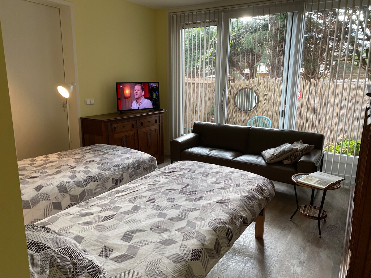 Jasny apartament typu studio w cichej dzielnicy mieszkaniowej 10-15 minut spacerem do dworca głównego. Kawiarnie w pobliżu, a więcej w zabytkowym centrum Leiden 20 minut spacerem. Prywatne wejście, łazienka, materace deluxe, stół, stołki. Własna, dobrze wyposażona spiżarnia, lodówka, kuchenka mikrofalowa, toster itp. Własna pralka, magazyn. Piękny zalesiony park, przyjemna herbaciarnia. Wydajne pociągi co godzinę do lotniska (16 minut), Amsterdamu (40 minut), plaży (autobus 20 minut). Dostępny bezpłatny i płatny parking.