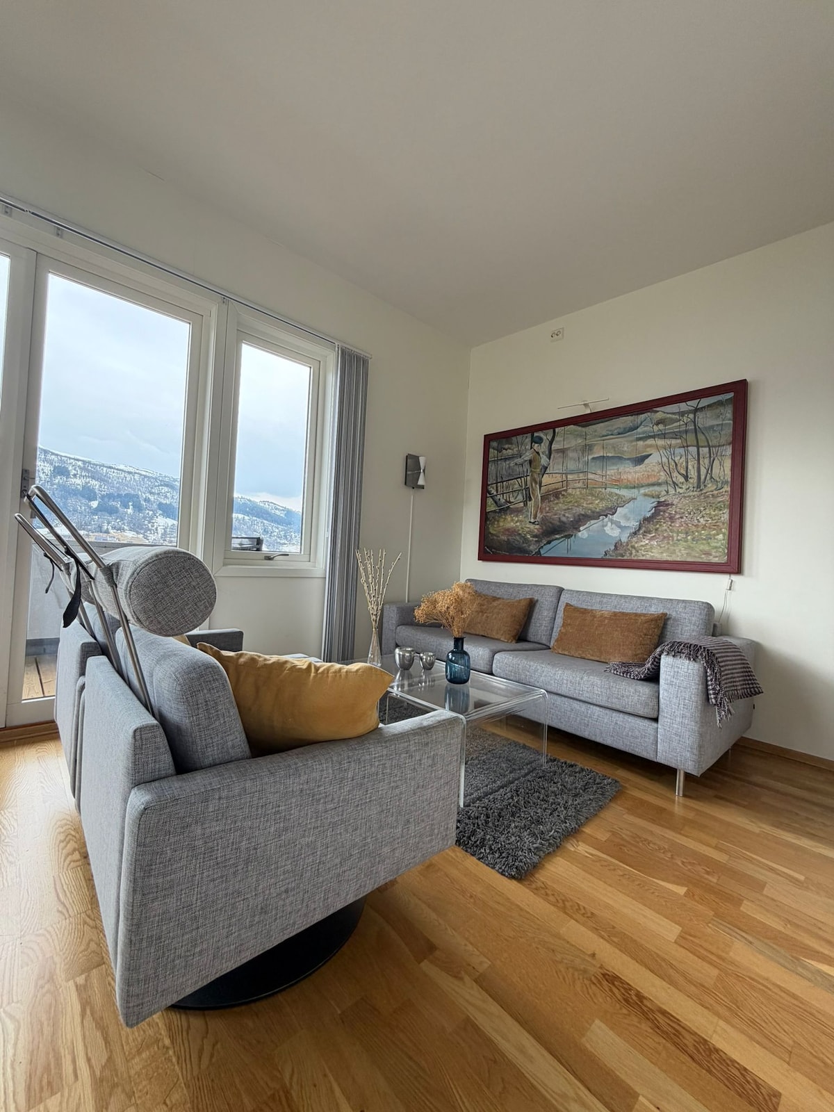 Duże mieszkanie na drugim piętrze z pięknym widokiem na góry i fiord. Apartament posiada trzy sypialnie i jedną łazienkę. 150 metrów (1 minuta spacerem) do sklepów spożywczych, restauracji, pubów, akwarium, informacji turystycznej, wypożyczalni kajaków, wycieczek, galerii sztuki i muzeum podróży i turystyki. Mamy łóżeczko, wysokie krzesełko, wózek, pudełko z zabawkami i naczynia dla dzieci itp., jeśli zajdzie taka potrzeba