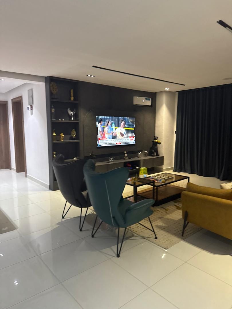 Przestronny salon i królewska łazienka z łóżkiem typu Super king, nowoczesną łazienką i toaletą🚽. Bardzo czysty i standardowy apartament. Royal Pent House zapewnia nowoczesny komfort poza Twoją wyobraźnią dzięki nieograniczonemu szybkiemu WiFi, 43-calowemu telewizorowi w sypialni i 55-calowym Smart Tv w salonie, YouTube, Netflix, DSTV. Wygodna sofa, podgrzewacz wody, czajnik wodny, kuchenka mikrofalowa, gaz do gotowania. Czujnik dymu, czujnik dwutlenku mono, zasilanie 24/7. , Cctv, maksymalne bezpieczeństwo z całodobową ochroną
