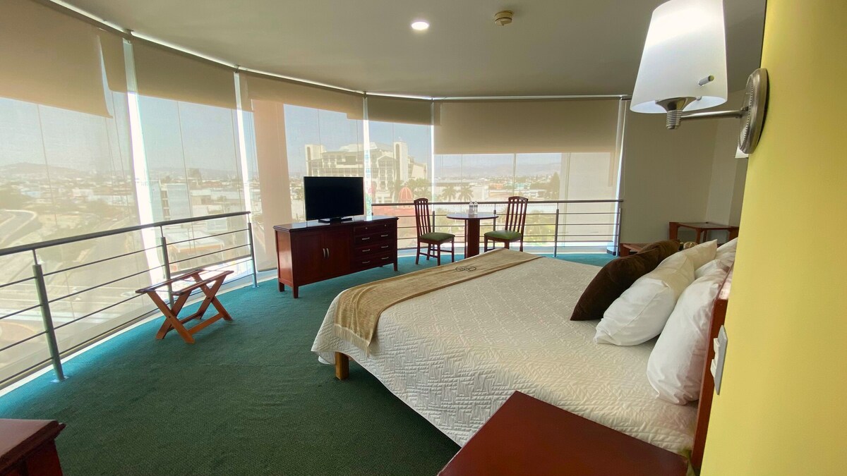 Główny apartament hotelowy w jednym z najważniejszych obszarów turystycznych i rekreacyjnych w León z niesamowitym widokiem na dzielnicę La Calzada w Los Héroes. W pokoju znajduje się duże łóżko i 1 sofa, jacuzzi, codzienne sprzątanie, biurko, butelkowana woda w ramach uprzejmości, udogodnienia toaletowe, prywatna łazienka z ciepłą wodą przez całą dobę, zimna klimatyzacja, spersonalizowana uwaga 24 godziny na dobę.
