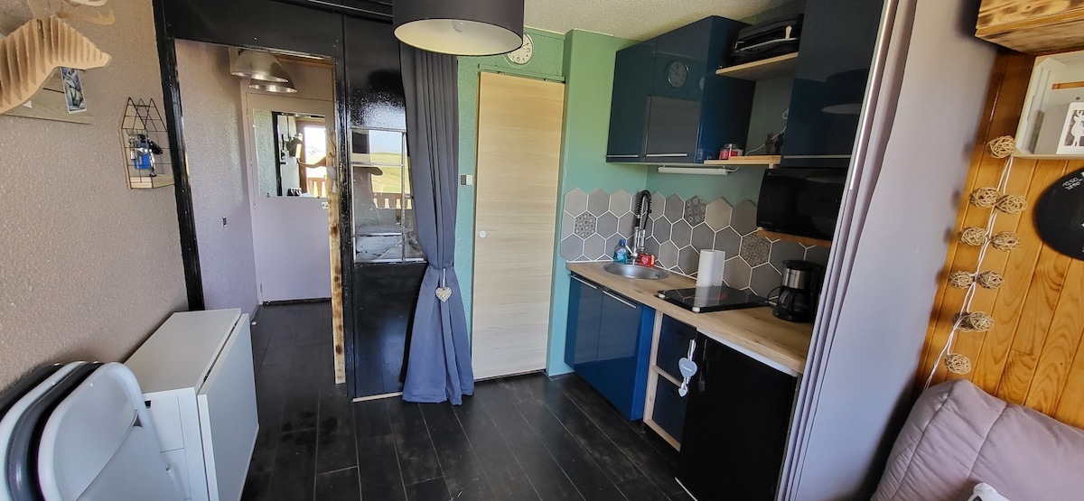 Ładne studio u podnóża stoków z widokiem na Mont Blanc
