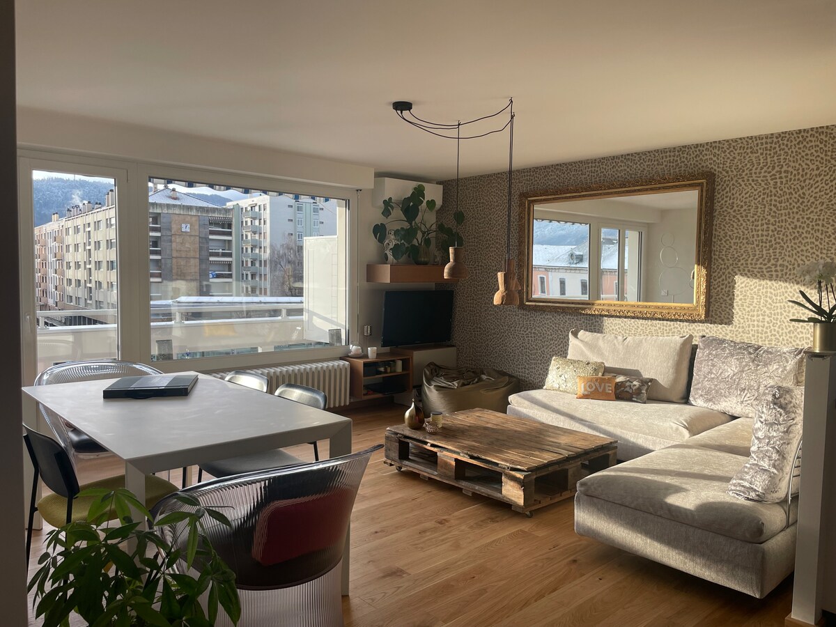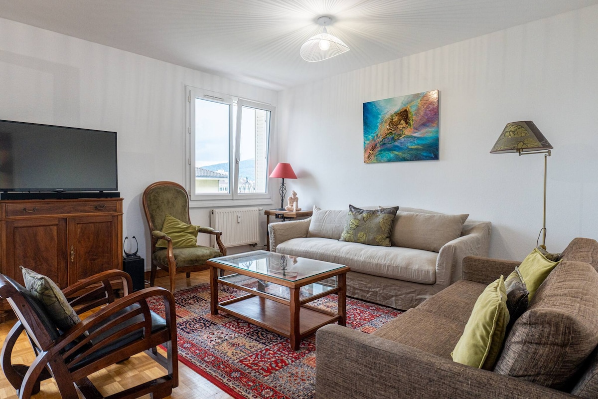 Apartament T2 o powierzchni 48 m2 idealnie położony w samym sercu Cran-Gevrier | Annecy, w tętniącej życiem dzielnicy obok centrum kulturalnego La Turbine. Apartament znajduje się na 4 piętrze budynku z windą i dysponuje garażem w piwnicy. Idealna lokalizacja: 5 minut jazdy samochodem, 7 minut jazdy rowerem i 20 minut spacerem (promenada Thiou) od zabytkowego centrum Annecy. Sklepy, restauracje, bary, piekarnia i sklep spożywczy na dole budynku. Wi-Fi – 1 sypialnia – garaż – Amazon Prime