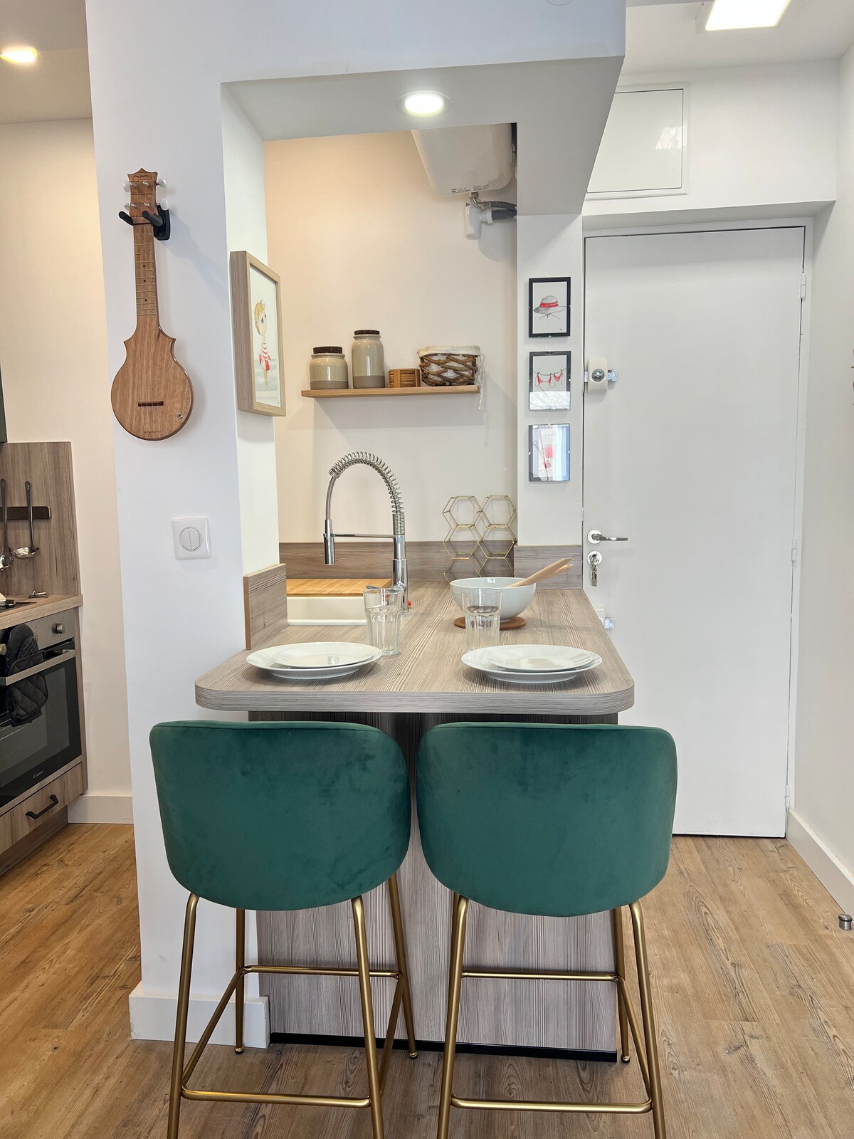 Venez découvrir notre location dans une petite résidence située à 20 mètres de la plage. Appartement T2 entièrement refait à neuf de 42 m2 situé au 2ème étage avec balcon et vue mer. Composé d’une cuisine ouverte sur séjour avec canapé convertible pour couchage quotidien en 160x200. D’une grande chambre avec couchage en 160X200, bureau pour le télétravail, dressing. SDB avec grande douche, WC séparé. TV, Internet fibre, Climatisations, 1 place de parking dans la résidence. Proche tous commerces