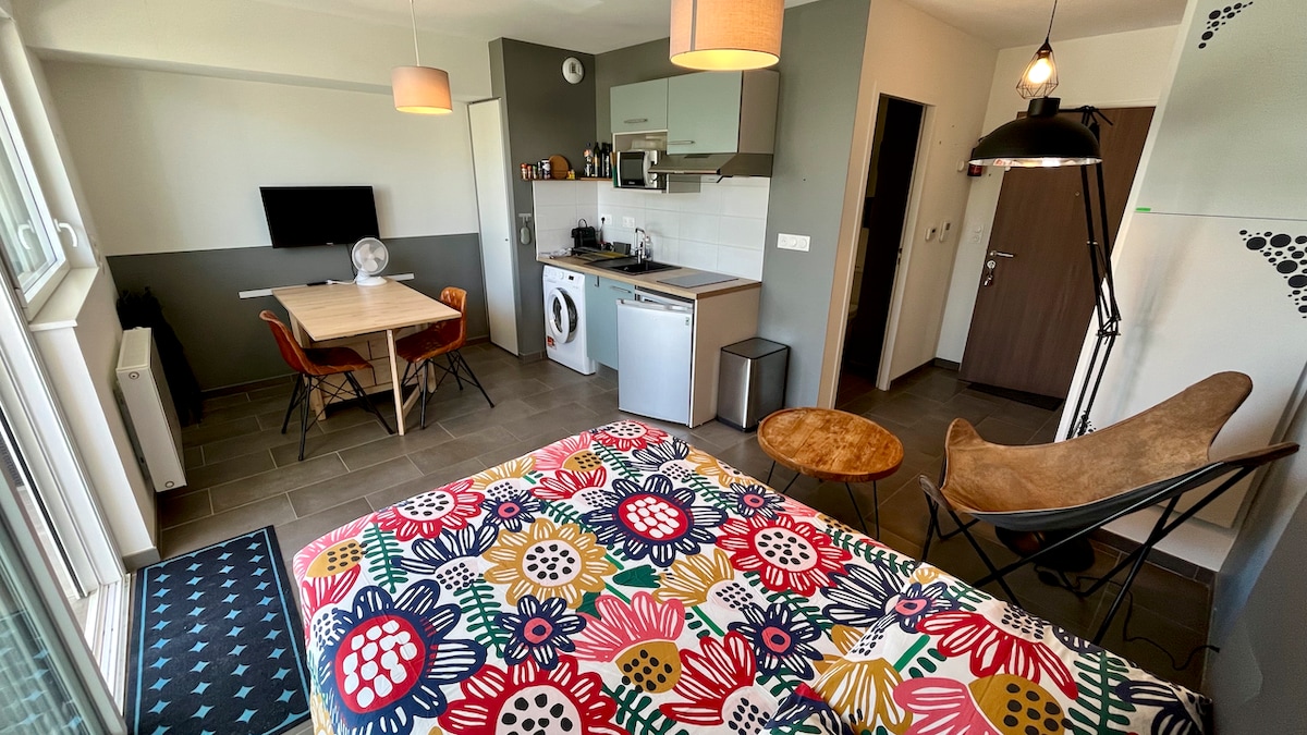 Jasny apartament o powierzchni 37 m2 na 4 piętrze z windą, z którego roztacza się wspaniały widok na wyspy Oléron, Aix, Ré i Fort Boyard. Znajduje się w cichej rezydencji w Les Minimes, w pobliżu plaż Les Minimes i Roux, przystani, nabrzeża i sklepów. W pełni wyposażony i starannie urządzony, jest idealny na pobyt dla pary, w pojedynkę lub zdalnie pracujących nad morzem. Wszystko jest gotowe, aby powitać Cię w najlepszych warunkach.