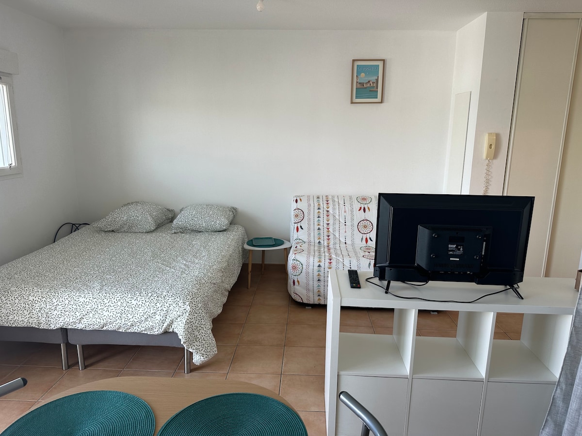 Witamy w tym odnowionym, ciepłym i nowoczesnym apartamencie na najwyższym piętrze z windą. Oferuje on: Salon z rozkładaną sofą, szklanym oknem, balkonem z otwartym widokiem. W pełni wyposażona otwarta kuchnia. Sypialnia ze schowkiem. Łazienka z toaletą. Zalety: Wi-Fi, prywatny parking. Blisko udogodnień i plaży. 10 min. od Starego Portu, w pobliżu ścieżek rowerowych, łatwy dostęp do Île de Ré i Ile d 'Aix. Zwierzęta nie są akceptowane, dla niepalących.