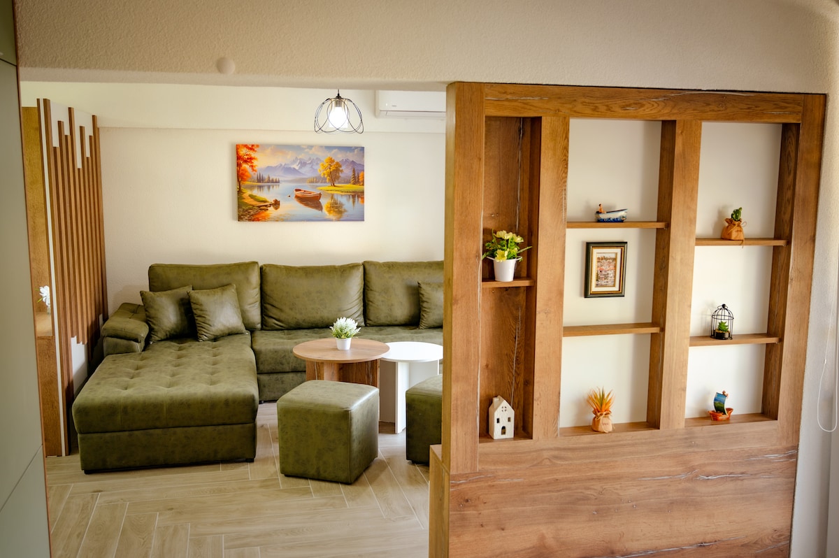 Apartament (na drugim piętrze) położony jest w najwyższym punkcie Pestani (Ochrydzie) i oferuje wyjątkowy widok na jezioro Ochrydzkie i górę Galicica. Otoczony zielenią i obfitością przyrody, możesz cieszyć się jednym z 5 tarasów z widokiem na jezioro lub górę, lub po prostu usiąść w ogrodzie przy fontannie i słuchać szumu rzeki. W apartamencie de luxe masz 2 sypialnie, 1 salon, w pełni wyposażoną kuchnię, łazienkę, toaletę, zamknięty taras z kominkiem i ogromny zielony ogród.
