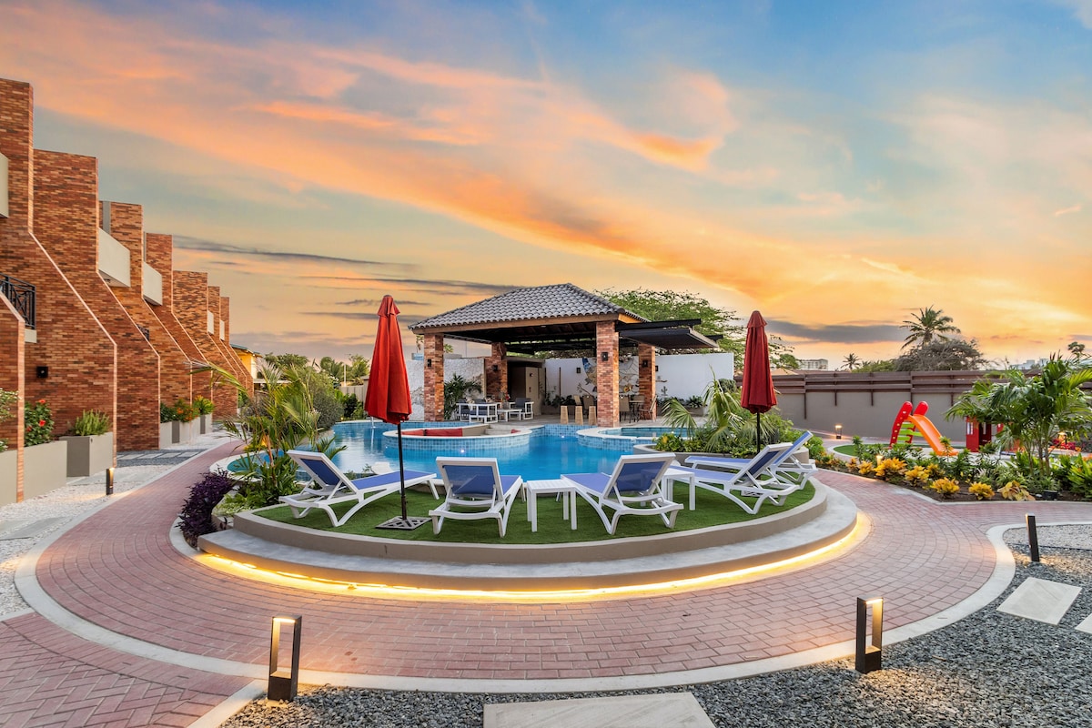 To idealne miejsce, by uciec od zgiełku i cieszyć się białymi, piaszczystymi plażami, piękną bryzą i gorącym słońcem Aruby. Niezależnie od tego, czy potrzebujesz wypoczynku dla par, rodzinnych wakacji, czy świętowania z przyjaciółmi, nie będziesz rozczarowany tym czystym, świeżym, nowo wybudowanym kompleksem. Nowo wybudowany basen znajduje się w centrum posesji. Wyposażony w leżaki z podkładkami do pluskania i krzesła ogrodowe do relaksu przy basenie. Każdy apartament wyposażony jest w przenośne leżaki, ręczniki plażowe i lodówkę.