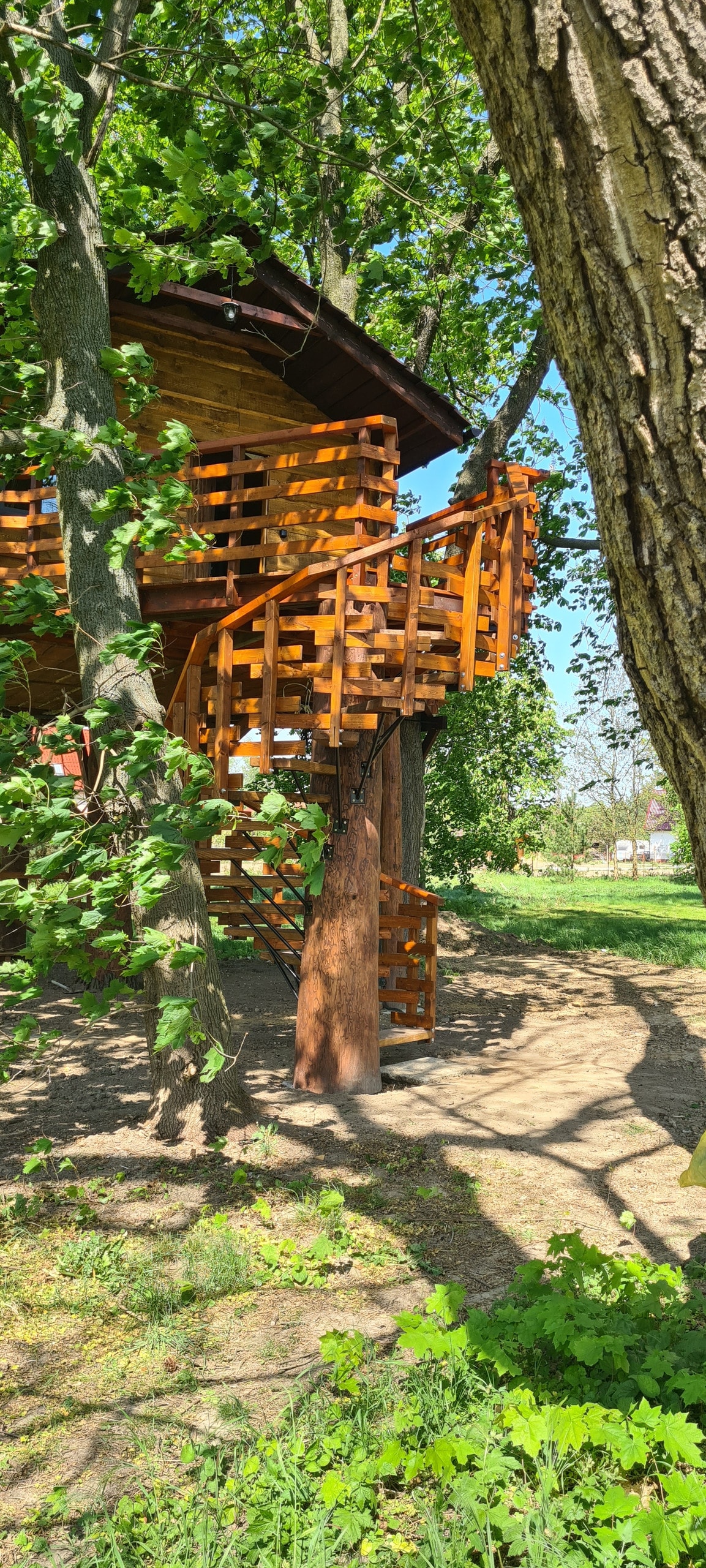 Trójkącik — Domek na drzewie w małym parku.