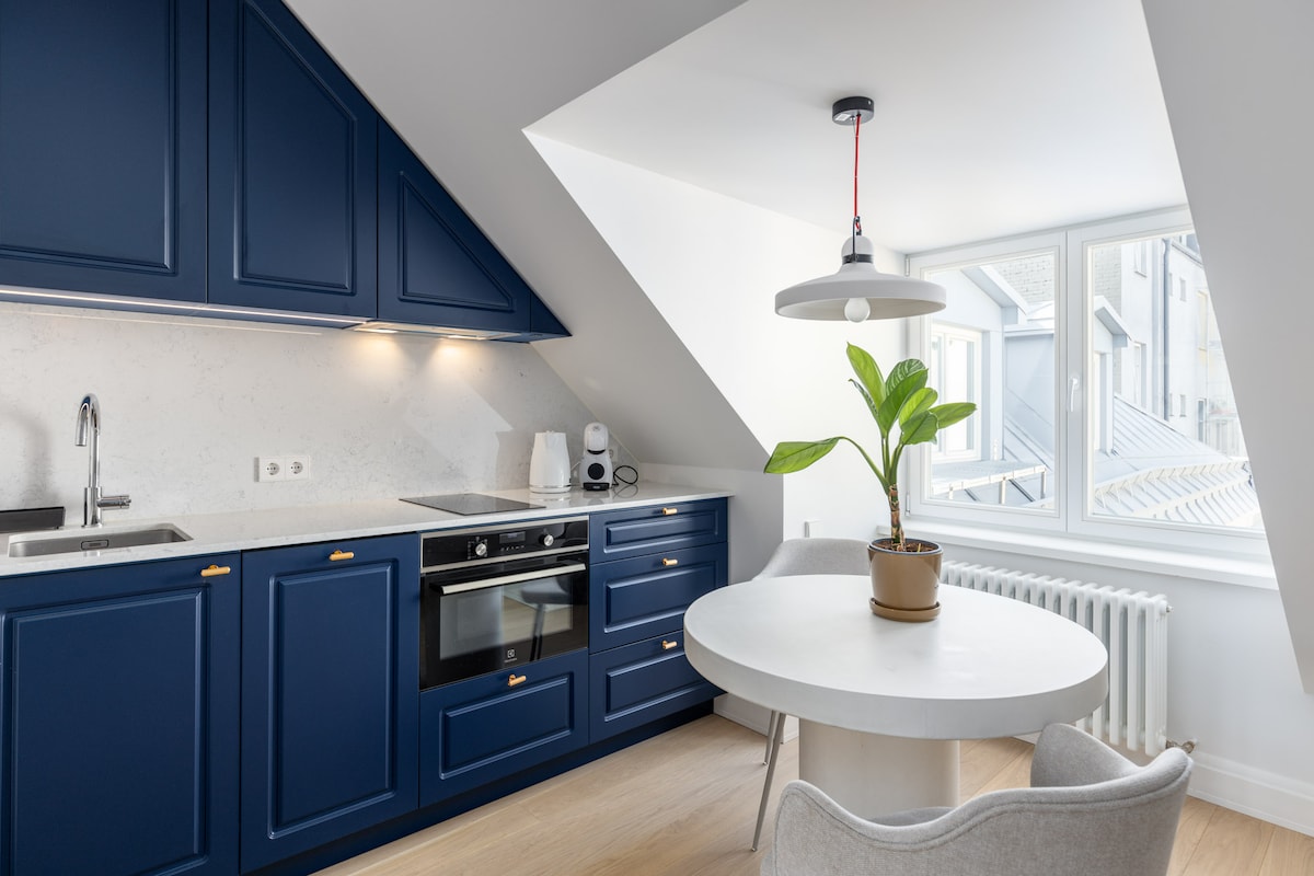 To wyjątkowe miejsce ma własny styl! Apartament z 1 sypialnią położony w w centrum Metropolis na rozległych tarasach Rezydencji Filozofów, jego goście mogą oddać się myślom i kontemplacjom nad najbardziej spektakularnymi krajobrazami Starego Miasta z iglicami kościelnymi Zamku Ryskiego. Z punktów widokowych widać rzekę Dźwinę pod mostem Vansu, niskie Kipsala i Pardaugava z miniaturowymi domami zanurzonymi w zielonych ogrodach.