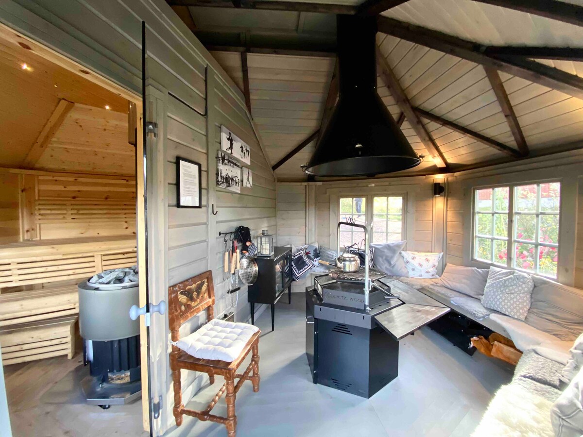 Semesterparadis bastu och badtunna i lugn natur
