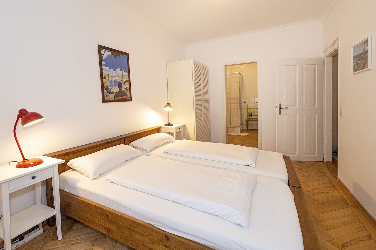 Die Unterkunft bietet ihnen ein Zimmer, zwei Betten, Tisch, Stühle, ein Schrank, sowie ein Wasserkocher, Tee und mehr. Das Badezimmer verfügt über ein großes Waschbecken und eine ebenerdige Dusche. Shampoo und Handtücher stehen selbstverständlich zur Verfügung. WC, Bad und Zimmer liegen zusammen und sind eine separate Einheit nur für sie. Eine große Glasfront mit Glastüre eröffnet einen Blick ins Grüne. Die vorzügliche Lage ist zentral, ohne Verkehr, ruhig, hell und grün.