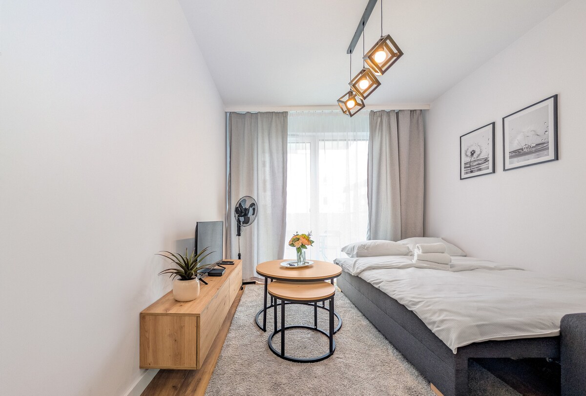 Nowoczesny apartament wyposażony we wszelkie udogodnienia - duże mieszkanie zmieszczone w niewielkim. W pobliżu centrum, ze świetnym połączeniem z każdym punktem Wrocławia. W odległości krótkiego spaceru restauracje, sklepy, siłownie, i centrum handlowo-usługowe. Mieszkanie z pełnym wyposażeniem - klimatyzacja, Wi-Fi, kuchenka indukcyjna, piekarnik, zmywarka, pralka, naczynia, a poza tym miejsce do odpoczynku i do pracy. Miejsce idealne dla 1-2 osób dorosłych.