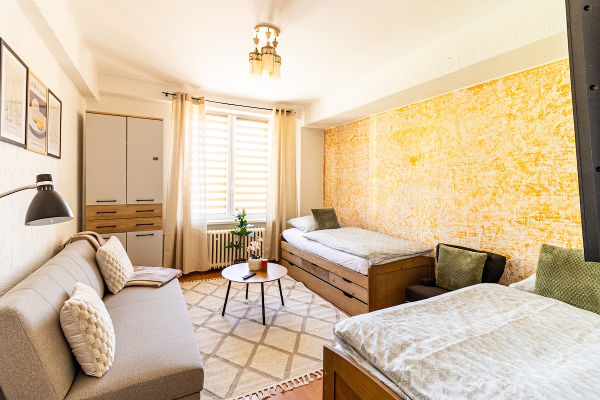 Odkryj urok naszego wyjątkowego apartamentu, położonego w samym sercu miasta, w cichej i malowniczej alejce, zaledwie kilka kroków od placu. Mieszkanie jest idealnym wyborem dla osób poszukujących oryginalnego zakwaterowania z odrobiną luksusu i relaksu. Wyjątkowe miejsce z prywatną sauną, w którym można się zrelaksować i naładować baterie po pracowitym dniu. Zrelaksuj ciało i umysł w naszej saunie – to idealny sposób na zakończenie dnia. Cena: 1000 CZK za 2 godziny. Napisz nam recenzję w Google, a otrzymasz ją za 700 CZK Z niecierpliwością czekamy na Twoje powitanie.