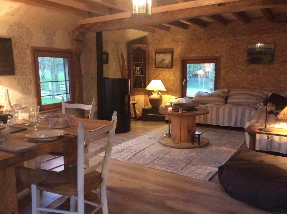 Mały domek całkowicie odnowiony. Salon z kominkiem i w pełni wyposażoną kuchnią. Na pierwszym piętrze, sypialnia na poddaszu i łazienka. Taras, duży otwarty ogród i sad z owcami przed oknami. Wokół : wioska i przyroda!