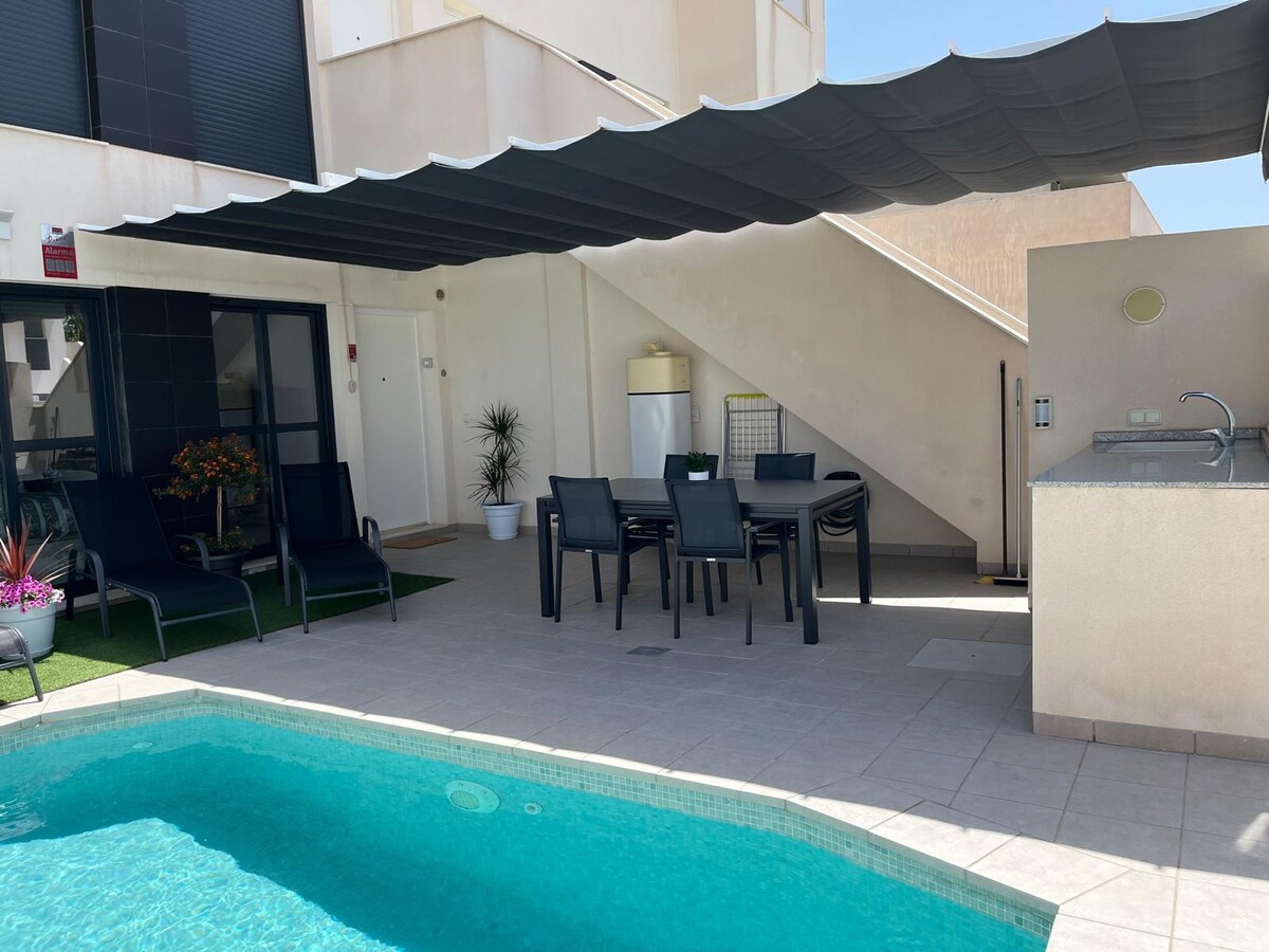 Kick back and relax in this calm, stylish space. Two bedrooms with double beds and sofa bed can fit up to 6 guests. All bedrooms and living room fitted with hot/cold air conditioners. There is all equipment for your comfortable stay. Enjoy BBQ , sun beds and refreshing shower in the roof. Or swim in communal swimming pool. Mar Menor beach and mud baths just 10 min walk distance. Murcia international airport 20 min and Alicante airport 50 min by car. Car rental available. VV. MU .3171-1