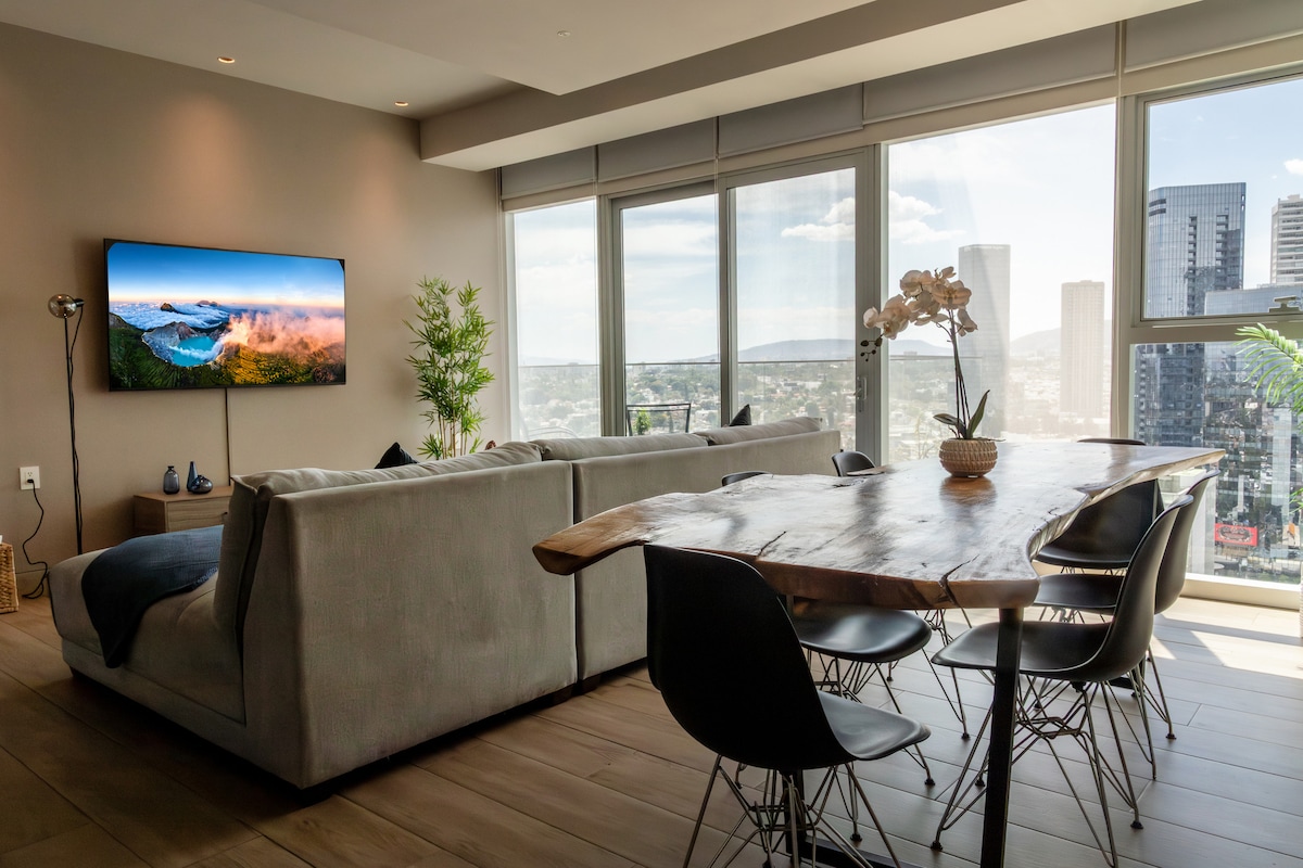 Lujoso departamento en piso 18 Lobby 33. Muy amplio con 2 habitaciones (King y Matrimonial), AC's, luces inteligentes, cortinas, internet, amenidades (alberca) con todo lo que necesitas para una estancia de un día o varios meses. La torre cuenta con centro comercial, restaurantes y acceso caminando a la plazas Andares, Landmark y Acueducto, y Bosque Colomos. Sanitizamos completamente antes de tu llegada. Favor de leer el reglamento previo a reservar.