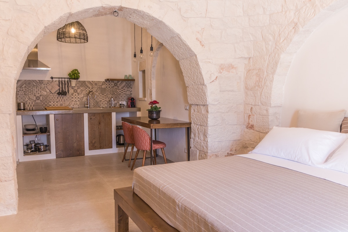 Wystrój wnętrz charakteryzuje się stylem typowym dla trulli, apartament wyposażony jest w klimatyzację i ogrzewanie, można korzystać z kuchni wyposażonej w naczynia, lodówkę, telewizor we wszystkich pokojach, z zewnętrzną altanką, w której można odpocząć i cieszyć się pięknem tego miejsca, rozkładana sofa z możliwością dodania na życzenie czwartego łóżka za darmo. Łazienka z kamienia, z prysznicem, toaletą, umywalką i akcesoriami: suszarką do włosów, pościelą, ręcznikami.