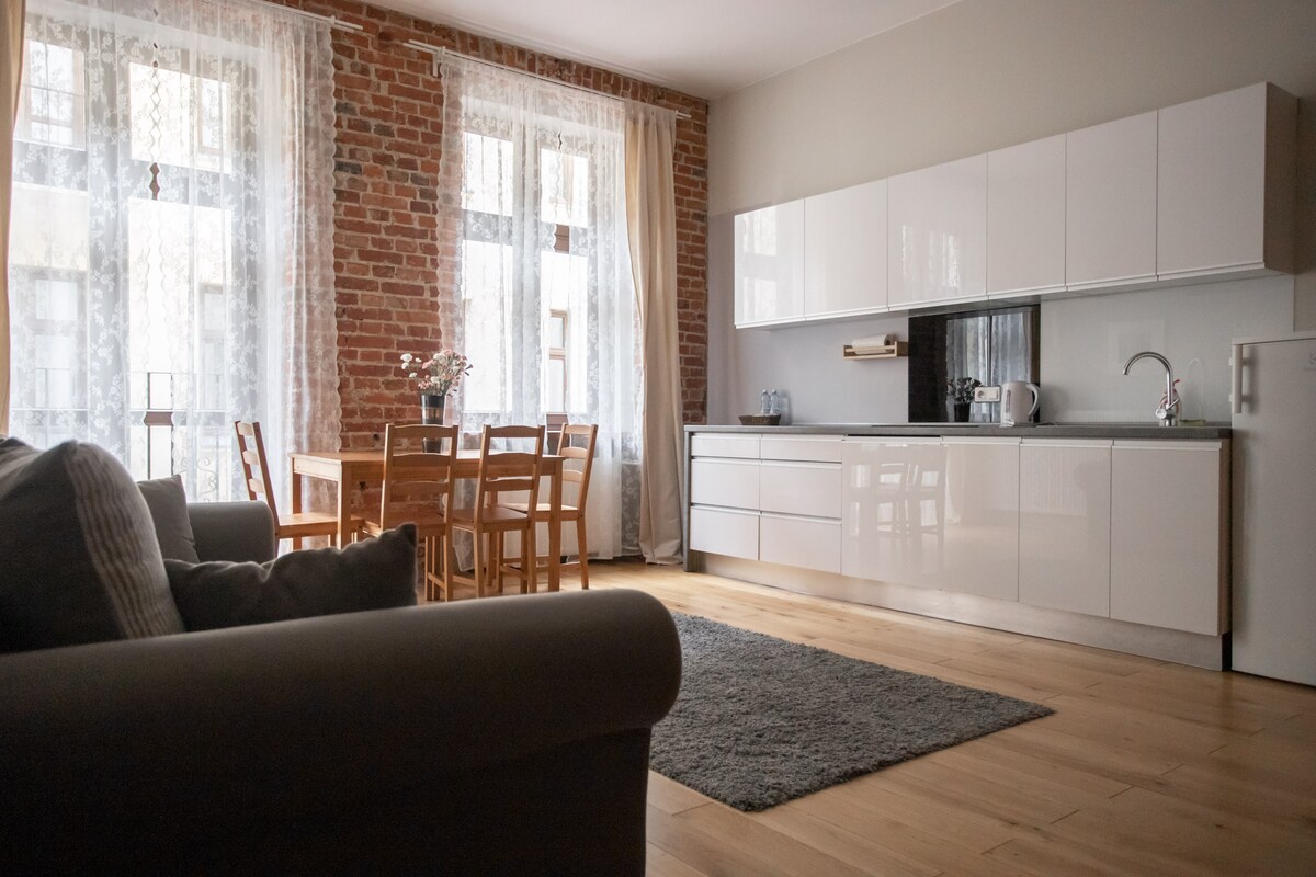 Przestronny jasny i stylowy apartament z dwiema oddzielnymi sypialniami, salonem z komfortową częścią wypoczynkową oraz dobrze wyposażoną kuchnią, w zabytkowej kamienicy bez windy. Goście zanurzą się w atmosferę XIX-wiecznej Łodzi - od starej klatki schodowej i ceglanych ścian po kameralnym lobby, w którym każdy detal przesycony jest duchem historii.