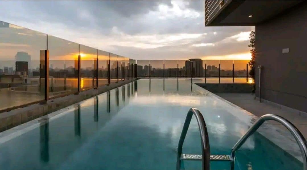 Oszałamiający widok na dach z basenem i ogrodem