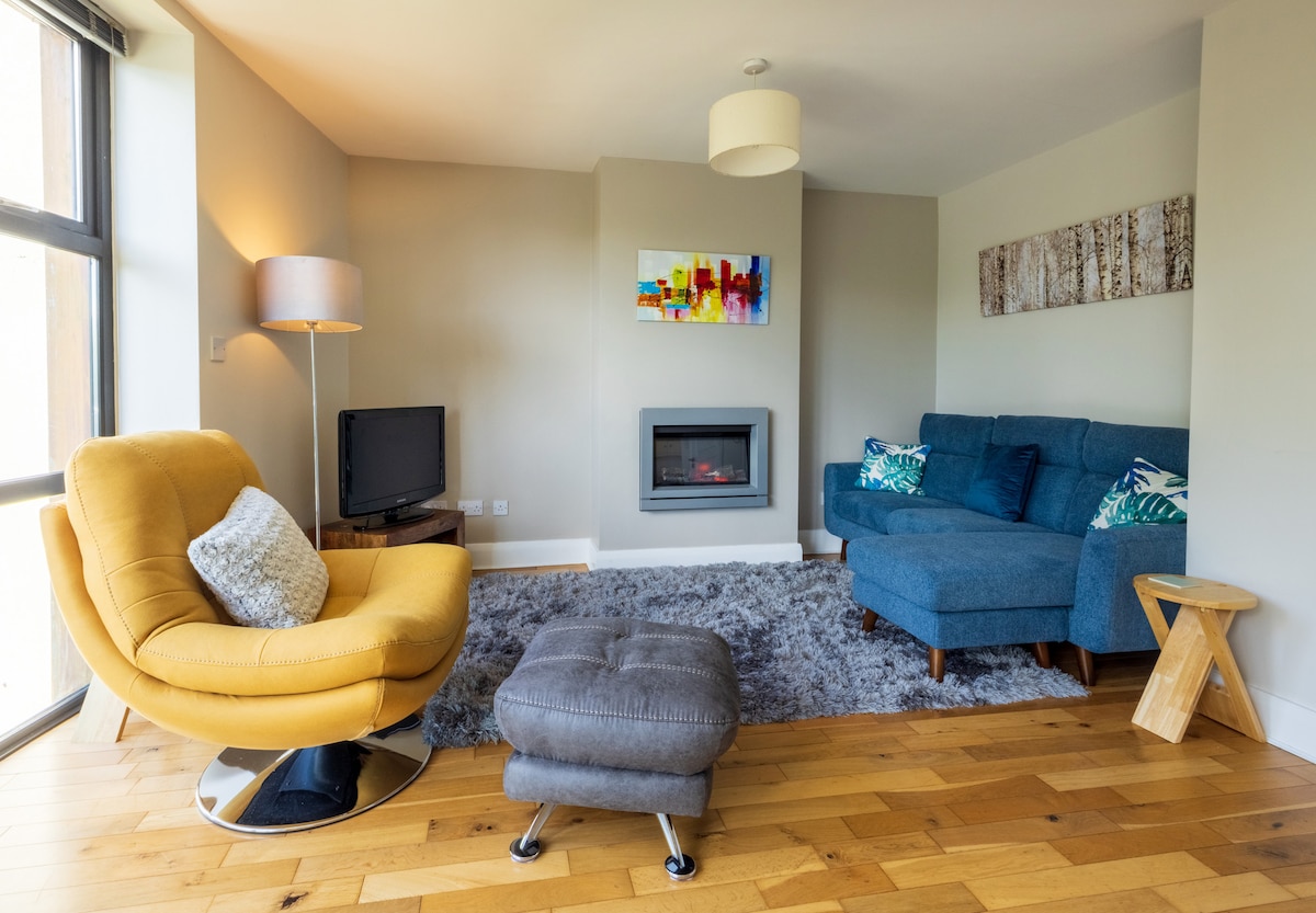 Ciesz się wyjątkowym wypoczynkiem w tym jasnym i nowoczesnym apartamencie na pierwszym piętrze, nad brzegiem rzeki Moy w wiosce Foxford. Wypij wieczorne drinki na balkonie nad rzeką lub obserwuj bystrza przez szklaną ścianę salonu. Niedawno odnowione wyposażenie hotelowej jakości, dwie dobrze prezentujące się sypialnie dwuosobowe, dwie łazienki i duża, otwarta przestrzeń mieszkalna. Wi-Fi o prędkości 67 Mb/s jest idealne do pracy zdalnej, a spacer nad rzeką i historyczne Foxford Woollen Mills są tuż obok.