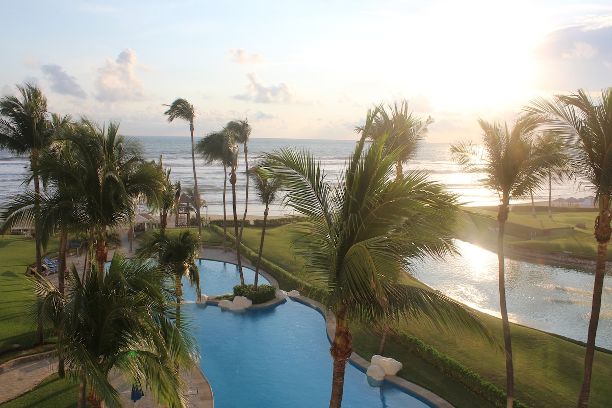 ** NISKIE CENY DLA MAŁYCH GRUP. Prosimy o zapytanie.** Jest to elegancki i gustowny apartament przy plaży w Real Diamante z bezpośrednim dostępem do plaży i dużym prywatnym tarasem. Luksusowy apartament w niskim budynku z bezpośrednim dostępem do plaży z białym piaskiem. Rozległy taras z panoramicznym widokiem na ocean i basenem. Położony w regionie Diamante w Acapulco – bezpieczny, piękny, luksusowy – 3 baseny bez krawędzi.
