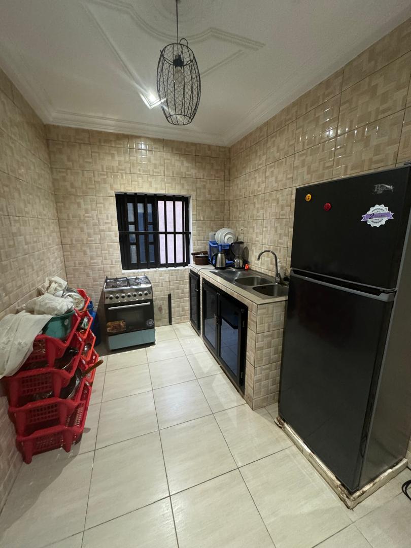 Cet appartement neuf de la Résidence Djidjole comprend 2 chambres à coucher avec chacune sa salle salle de douche, 1 cuisine fermée équipée et un grand séjour avec télévision et Canal plus. Une grande cour couverte est à disposition pour recevoir vos convives. Cuisine équipée avec gazinière et un grand frigo. Lave-linge dans la Résidence. Wifi gratuit. Electricité selon consommation avec Cash Power.